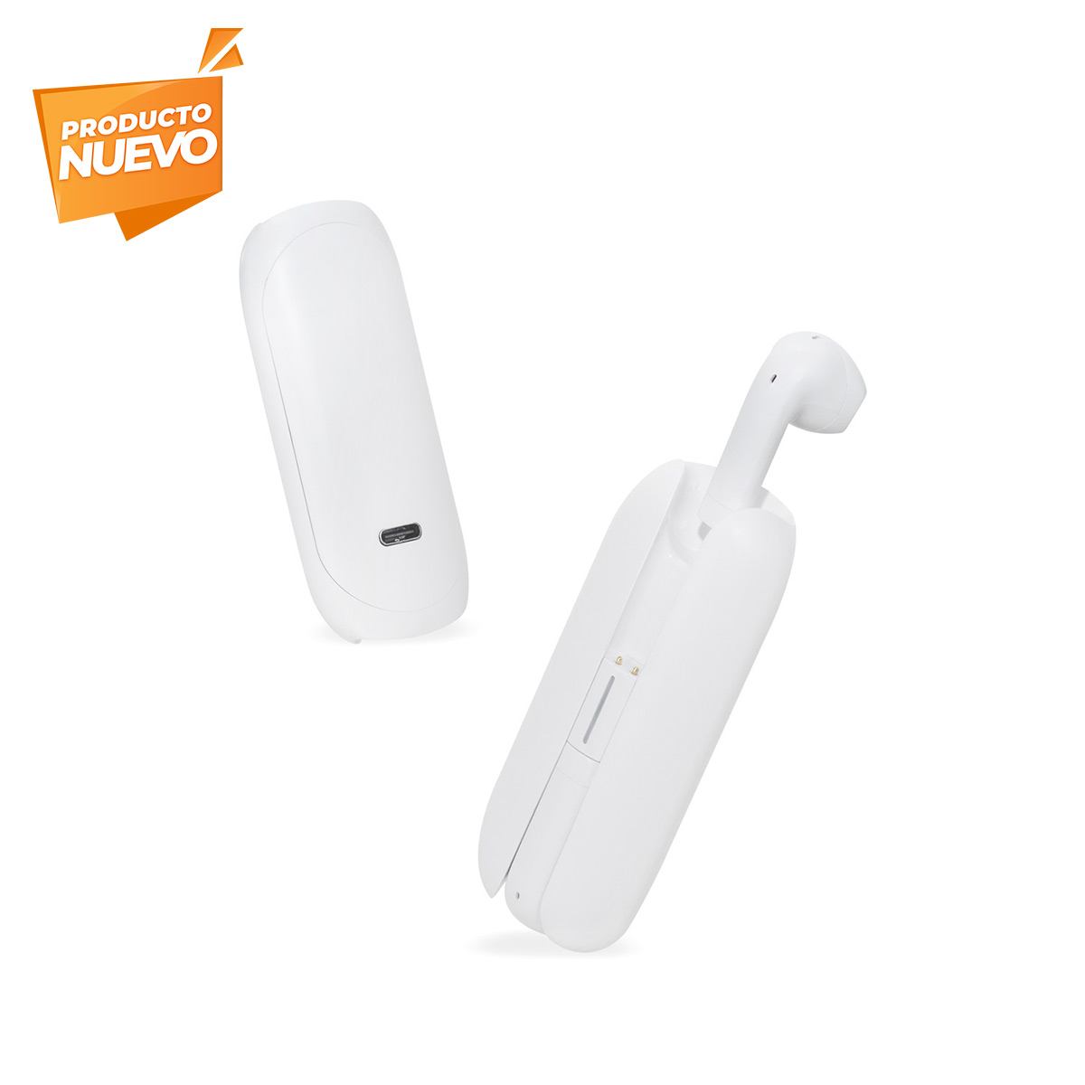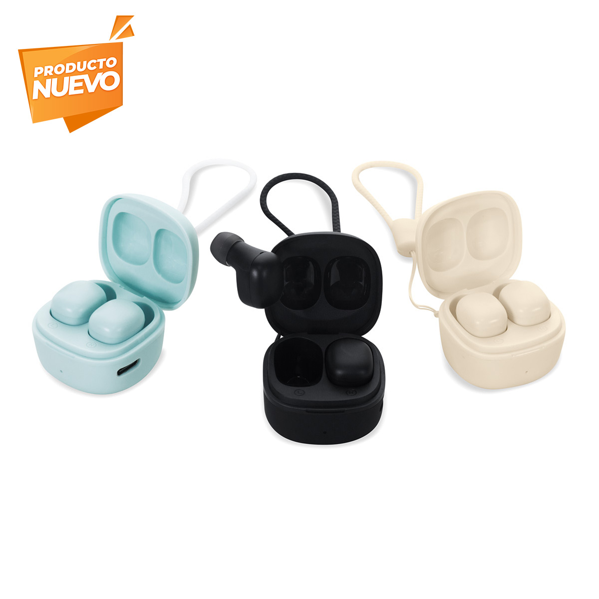 Audífonos bluetooth con base recargable. Estuche ultra compacto con asa de silicón para llevarlo a todos lados. Controles integrados touch para llamadas, volumen y reproducción de audio. Reproducción de música 3 a 4 hrs aproximadamente. Rango de conexión de 10 metros. Batería de 28 mAh en los auriculares y 180 mAh en el estuche de carga. Incluye cable cargador USB, estuche de carga con conexión tipo C y caja individual.