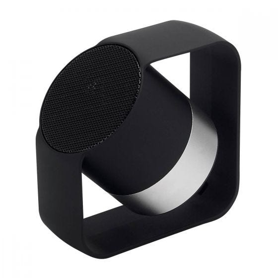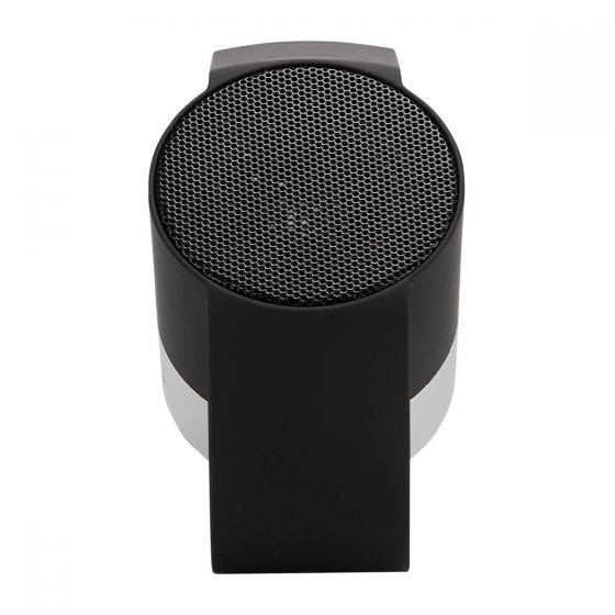 Bocina bluetooth con batería recargable. Controles integrados de volumen y reproducción de audio. Cable cargador USB incluido.