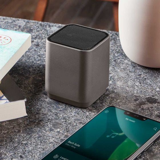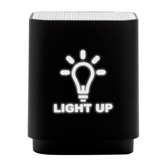 Bocina bluetooth con batería recargable. Cable cargador USB incluido. Logotipo se ilumina al grabar.