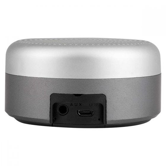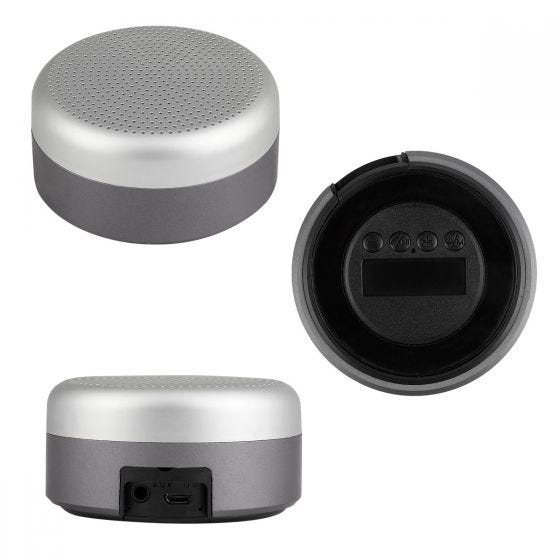 Bocina bluetooth con batería recargable de 2 horas de reproducción. Controles integrados de llamada, volumen y reproducción de audio. Función manos libres. Cable cargador USB incluido.
