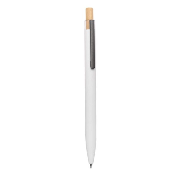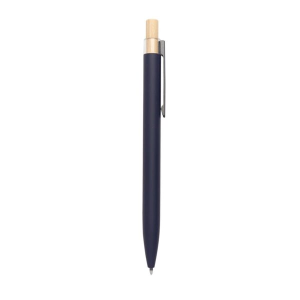 Bolígrafo con terminado tipo rubber. Mecanismo pulsador y botón de madera.