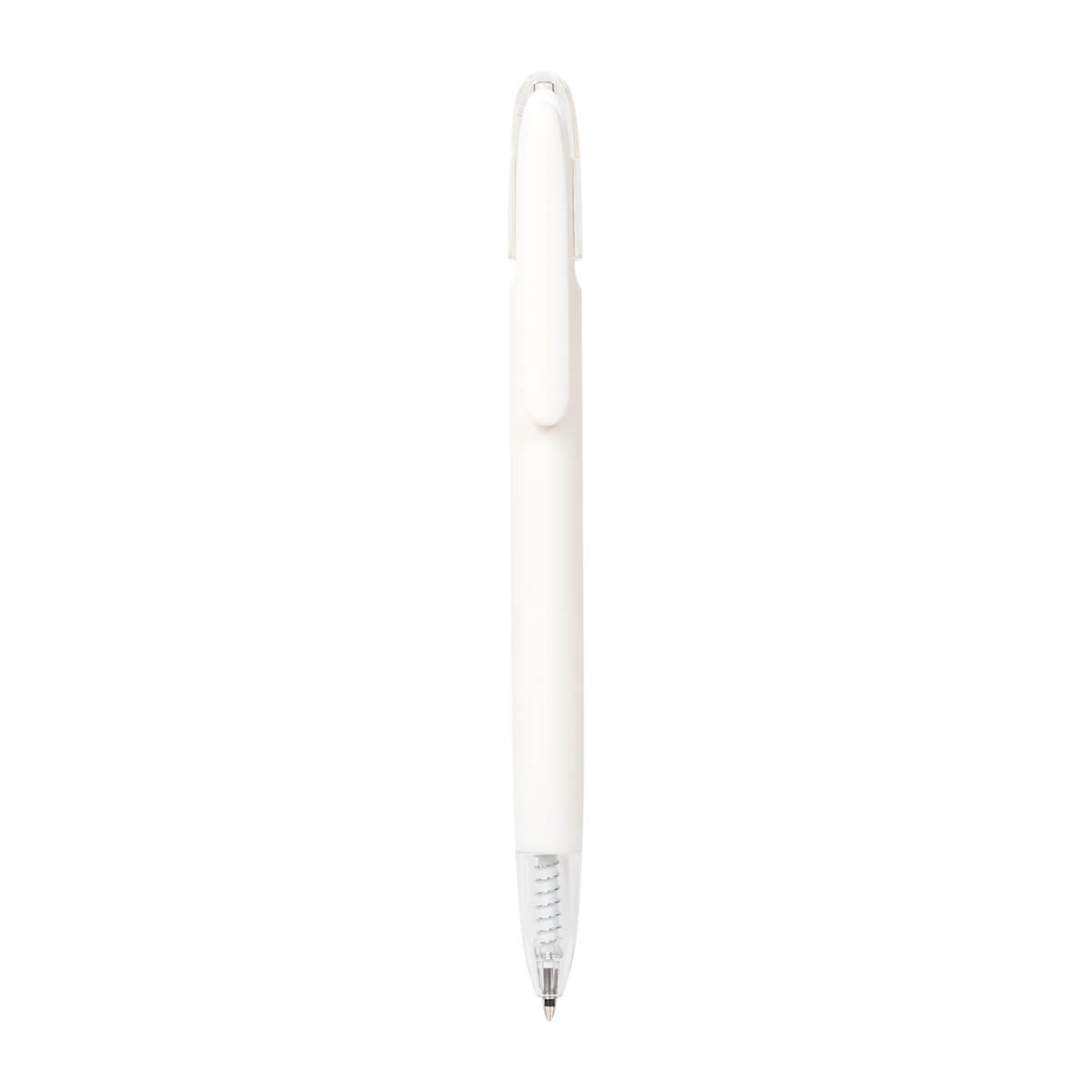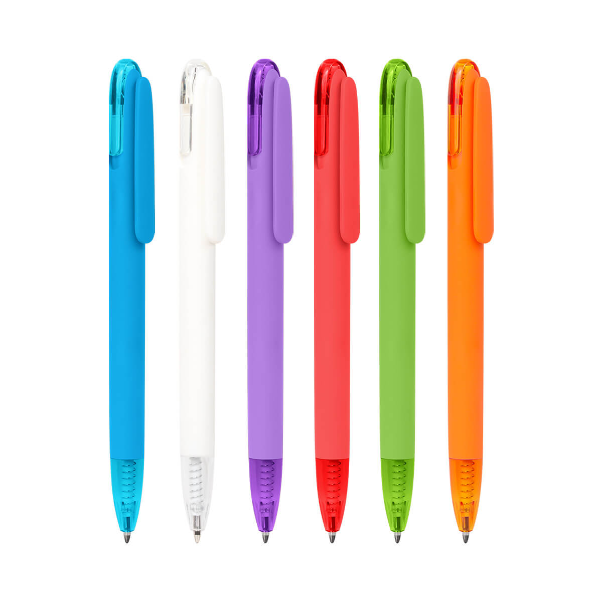 Bolígrafo de plástico con terminado rubber. Su contraste de material solido y translucido aportan un toque único a su diseño. Mecanismo pulsador.