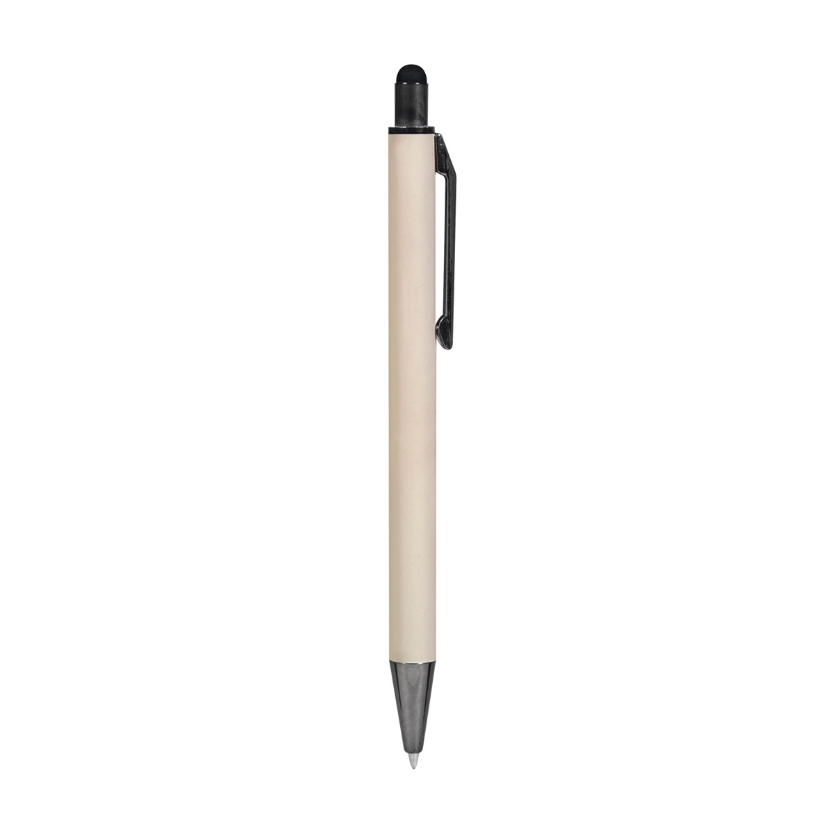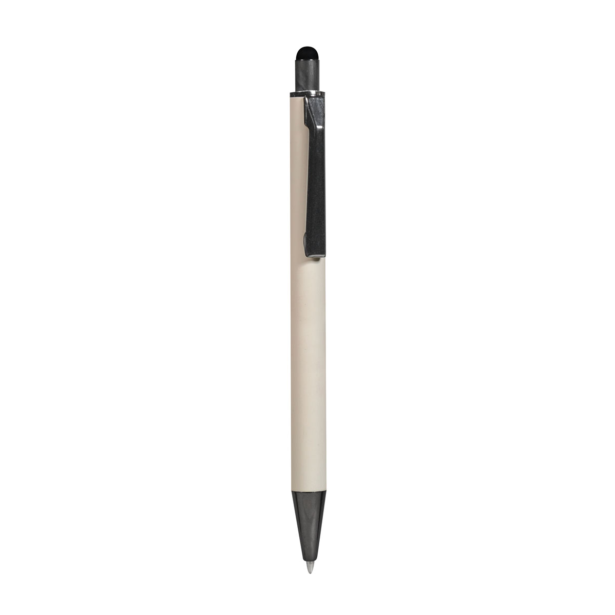 Bolígrafo con terminado tipo rubber y touch screen. Mecanismo pulsador. Clip y punta en color metalizado oscuro.