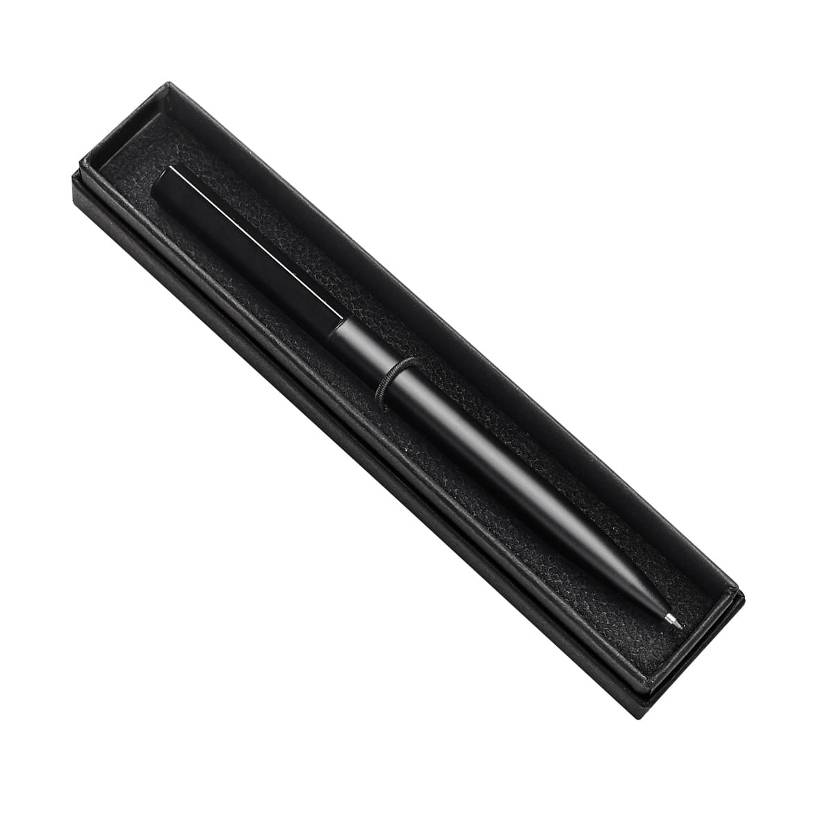 Bolígrafo con terminado mate. Mecanismo twist. Diseño estilizado sin clip. Incluye estuche.