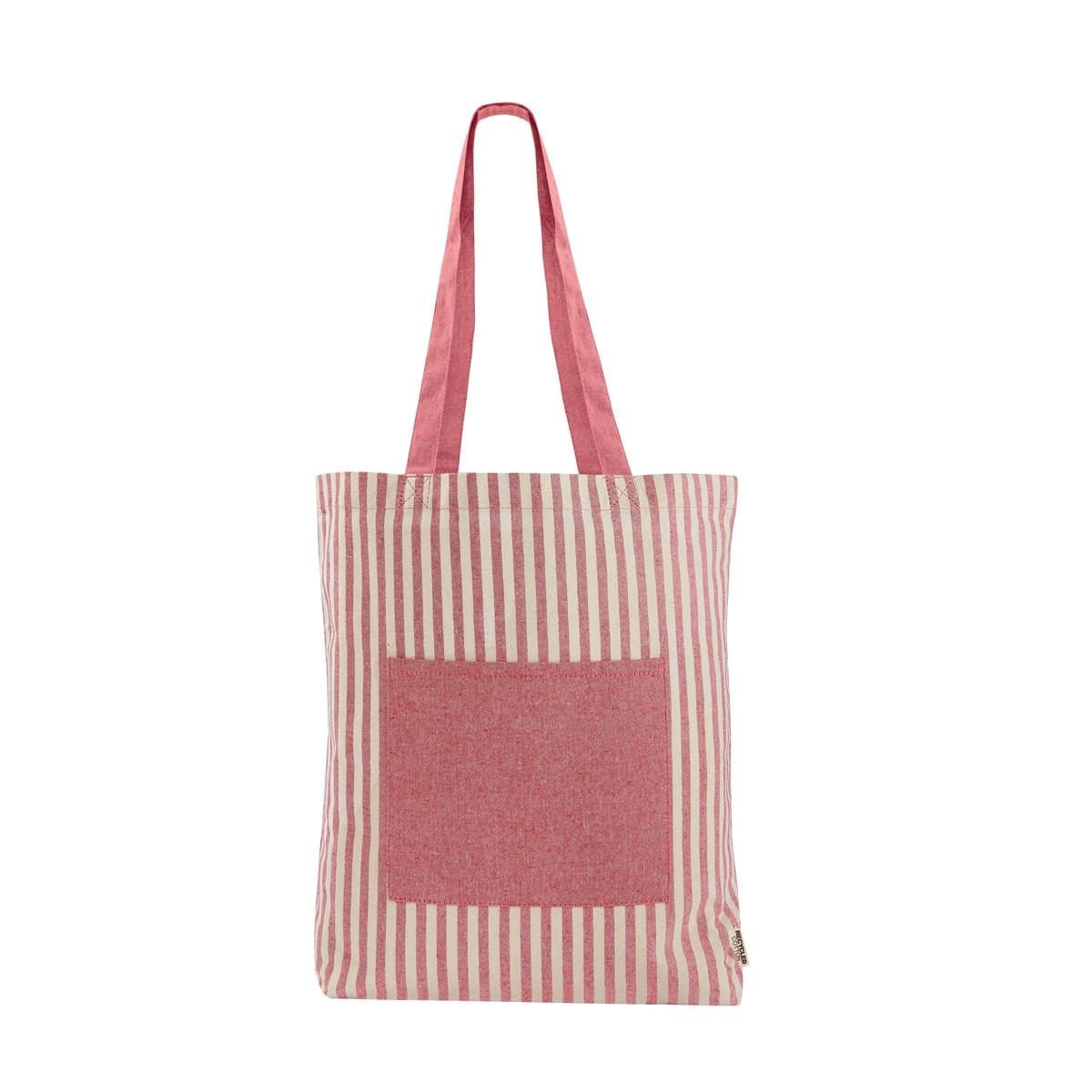 Bolsa ecológica de algodón reciclado. Sin fuelle. Incluye bolsillo frontal. Estampado de rayas.
