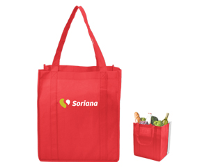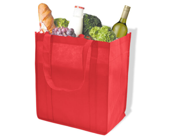 Bolsa rectangular con fondo plano en non woven, asas cosidas al cuerpo de la bolsa, fondo reforzado con base de cartón. Para todo uso.