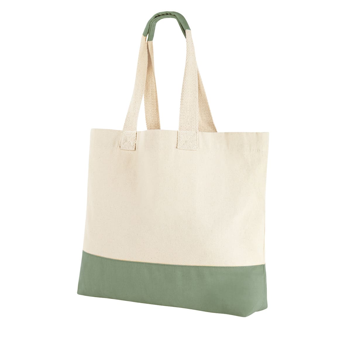 Bolsa con fuelle y asa de algodón. Base y detalle en asa con el mismo color.