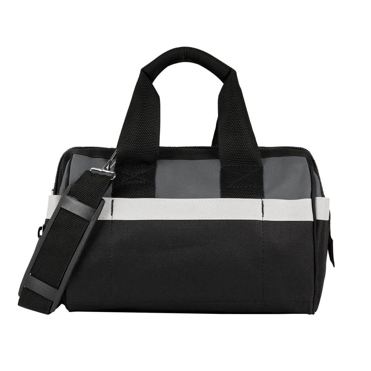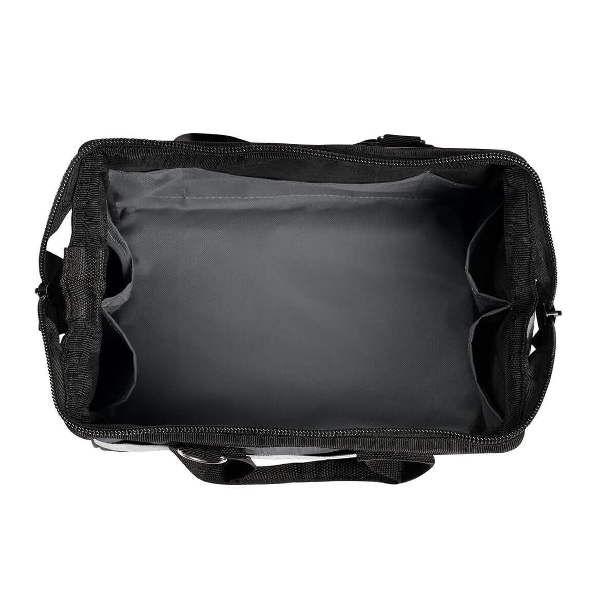 Compartimento principal con cierre y varilla metálica la cual permite mantener la estructura de la bolsa. Su abertura extra ancha permite el fácil acceso a las herramientas. 10 bolsillos internos y 10 externos. Incluye asas de mano y correa ajustable y removible con broche metálico para hombro.