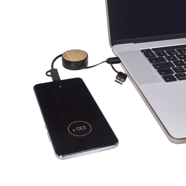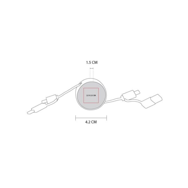 Cable cargador 3 en 1. Incluye conector de entrada USB y tipo C, conector de salida 2 en 1 con micro USB y lightning (8 pines) además de tipo C. Largo de cable 80 cm.