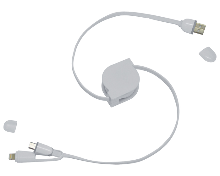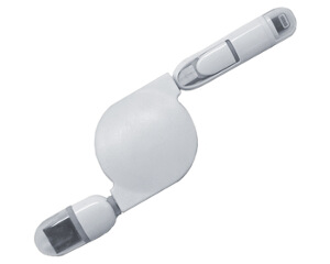 Cable retráctil para carga y transmisión de datos, para dispositivos iPhone y Android. Presentación: caja en color blanco.