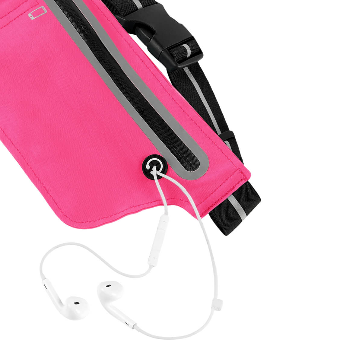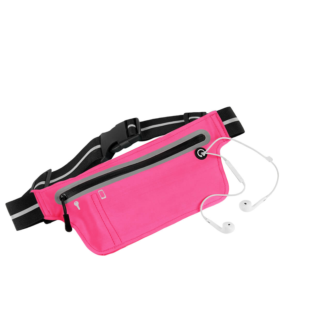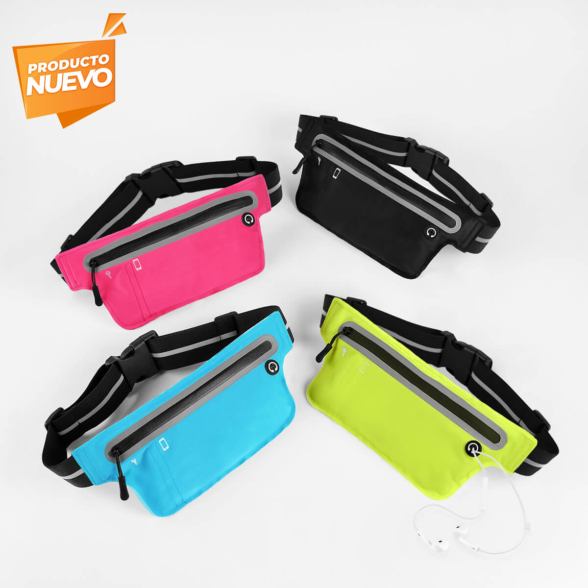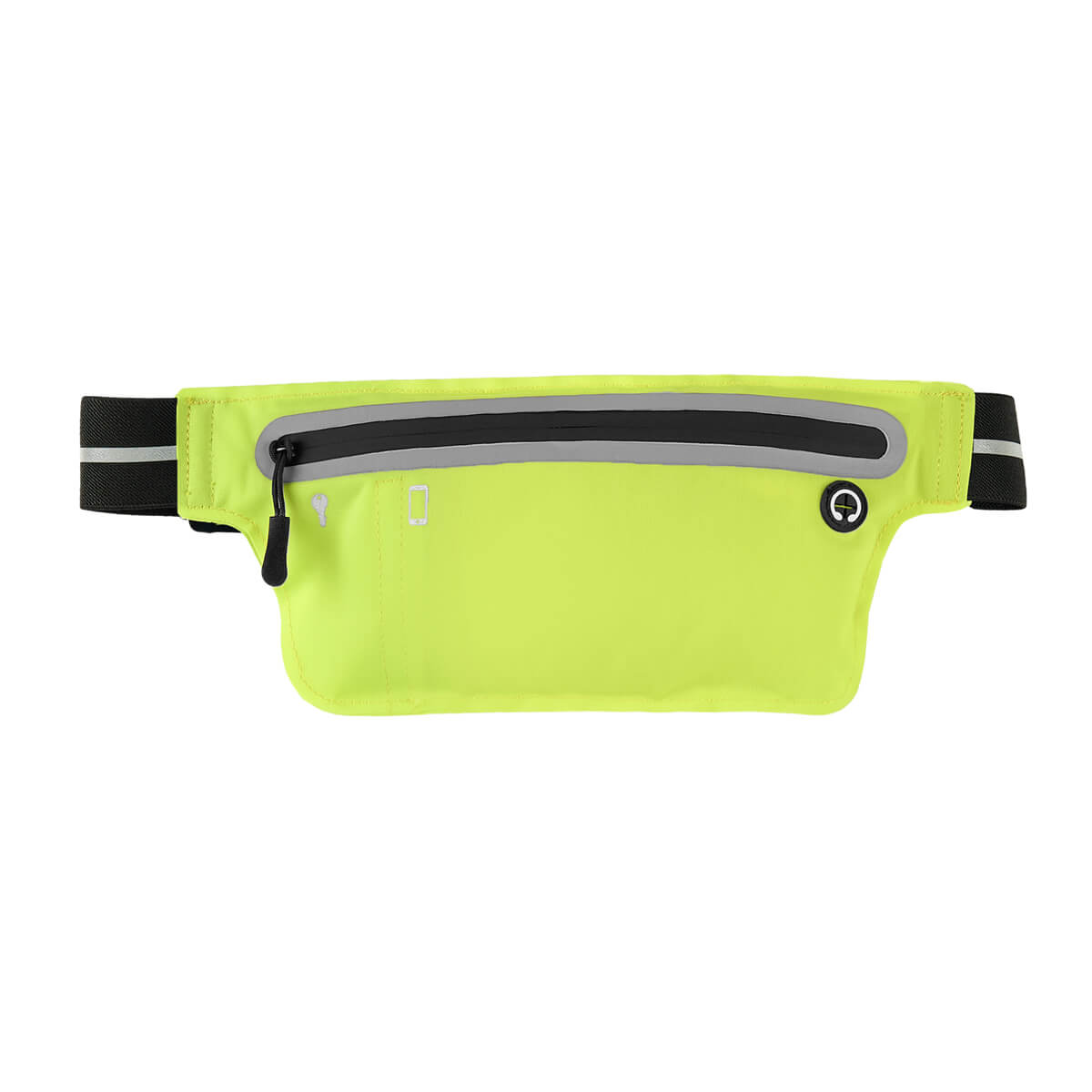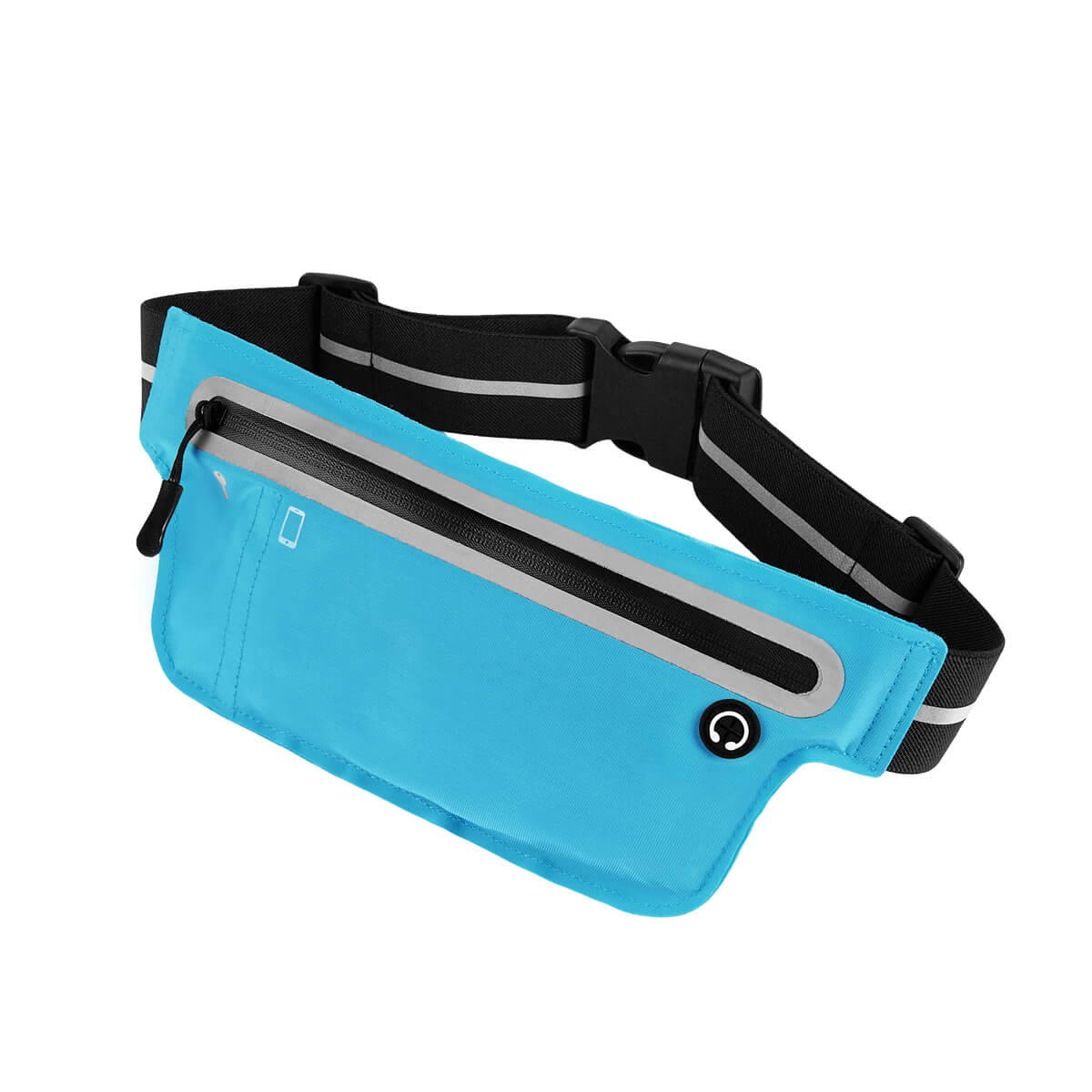 Cangurera deportiva ligera. Incluye interior plastificado. Ofrece resistencia al agua y comodidad en todo momento. Su compartimento con cierre y puller con correa permite guardar lo esencial, mientras que la salida para audífonos con cable te acompaña con música en cada paso. La banda elástica con broche de plástico se adapta fácilmente al cuerpo, y sus detalles reflejantes en cinturón y cuerpo brindan visibilidad extra en condiciones de poca luz.