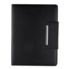 Incluye porta notas de raya con 20 hojas medida 8 x 10.5 cm, elástico para bolígrafo, compartimento para documentos y tarjetas, base con botón y elástico porta tablet. No incluye bolígrafo.