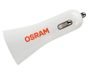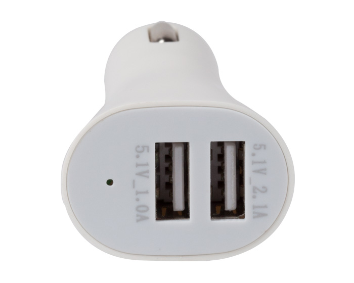 Cargador doble USB para auto, 5.1 V_2.1 A y 5.1 V_1.0A. VOLTAJE: 12 a 24 vdc. Cubierta plástica lisa.