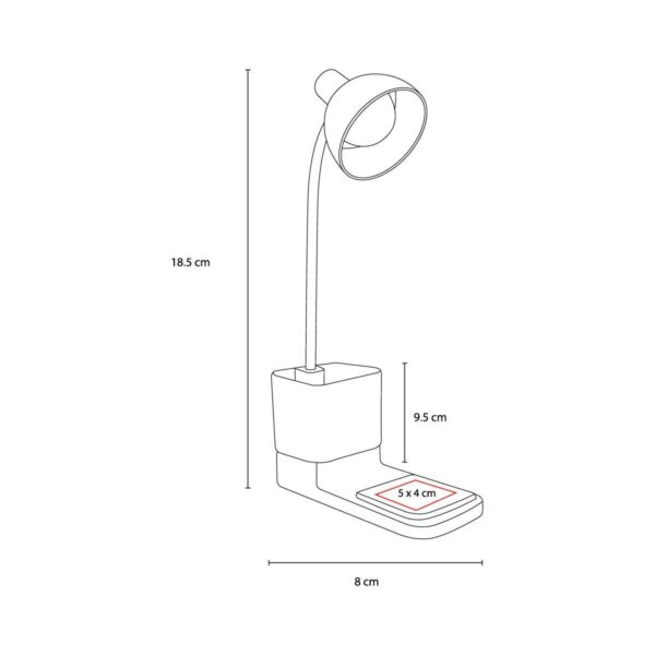 Cargador inalámbrico para smartphone, compatible con la mayoría de dispositivos comerciales que cuenten con tecnología de carga inalámbrica. Potencia de carga 5 W. Incluye lámpara con posición ajustable y porta plumas. Cuenta con entrada USB. Cable cargador incluido.