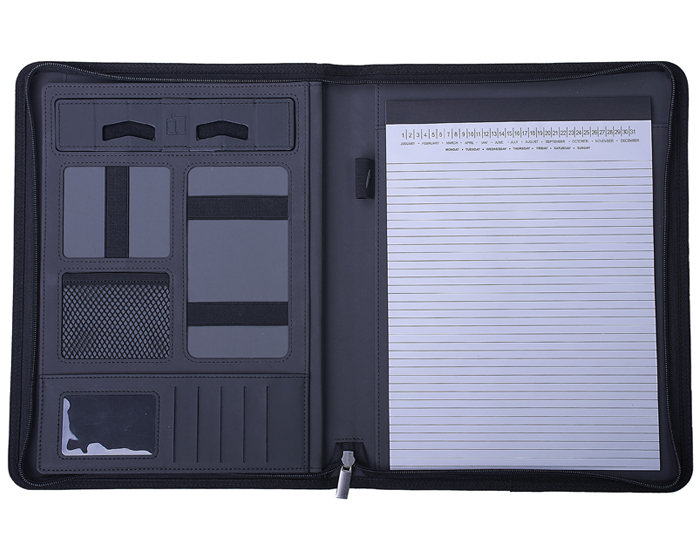 Carpeta multiusos con exterior en tela, cierre y compartimento externo para guardar tablet o documentos. Cuenta con block de notas tamaño carta de 20 hojas rayadas, compartimento interior para tablet, 2 soportes ajustables con velcro para sujetar tablets y celulares, cinta elástica para Smartphone, cinta elástica para memorias USB u otros accesorios, compartimento con ventana plástica para credenciales, divisiones para tarjetas, bolsa de malla, así como cinta elástica para fijar bolígrafo, el cual no viene incluido.