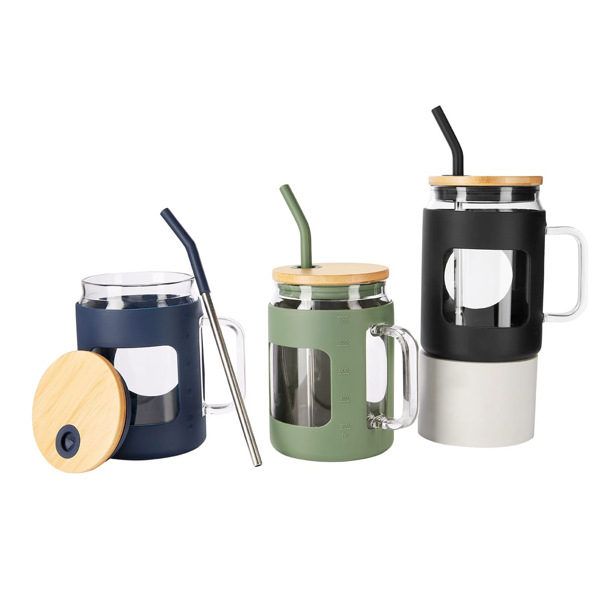 Cilindro de vidrio con asa y manga de silicón graduada en ml. Tapa de bambú con sistema de push y ranura para popote. Incluye popote metálico con boquilla de silicón. Vidrio resistente a bebidas calientes y frías. Caja individual incluida. El bambú es un producto natural el cual puede presentar variaciones en tonalidades y vetas. Este producto por ser últimas piezas puede presentar alguna variación, no se aceptan devoluciones.