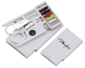 Costurero con tijeras. Incluye ensartador de agujas, botones, seguro, hilo, agujas y alfileres.