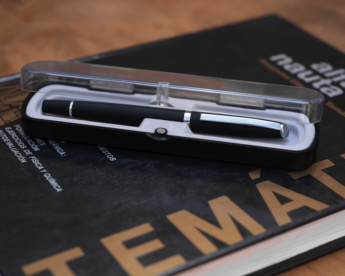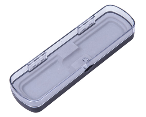 Estuche para bolígrafo con tapa transparente y cierre magnético. Interior en terciopelo gris. No incluye bolígrafo.