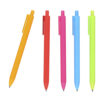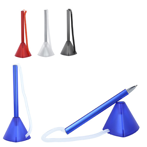 Bolígrafo con resorte plástico y base adhesiva que permite fijarse a superficie plana.
