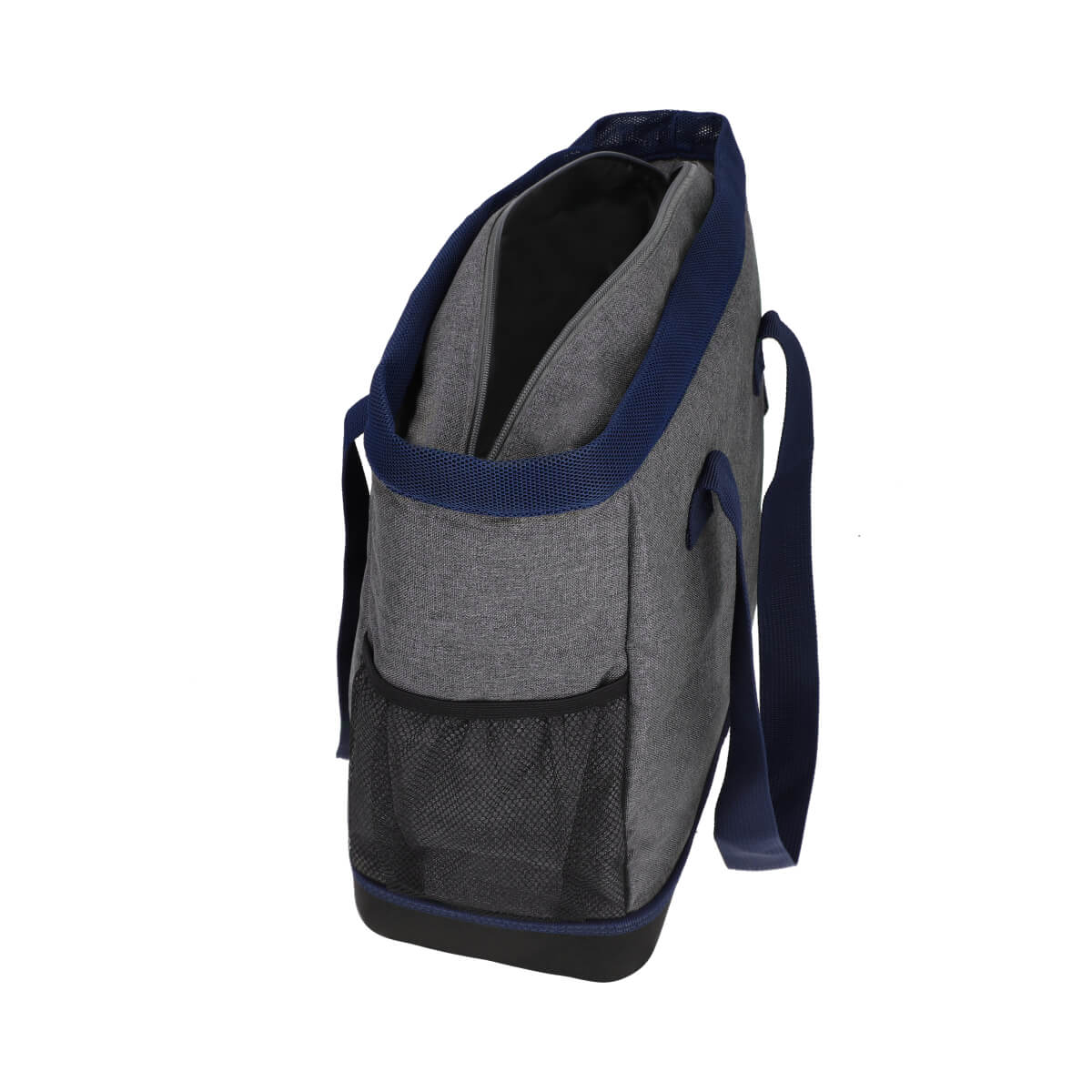Base rígida de EVA. Interior plastificado impermeable. Bolsa principal con cierre, bolsa lateral y frontal, bolsa lateral de red. Capacidad para 20 latas.
