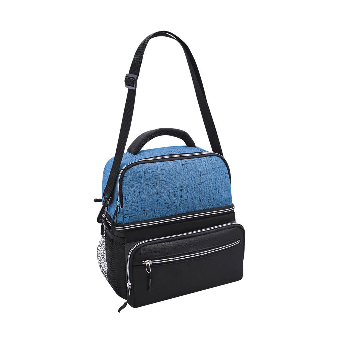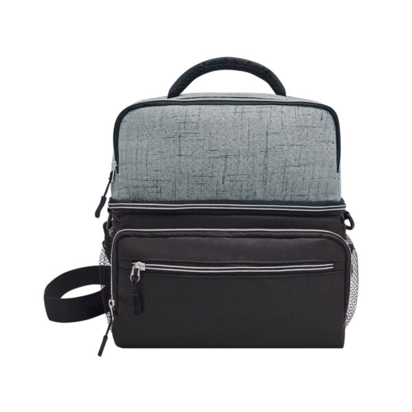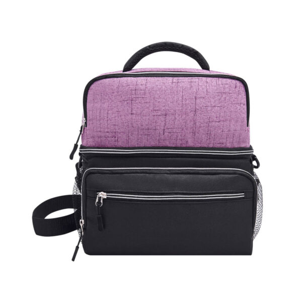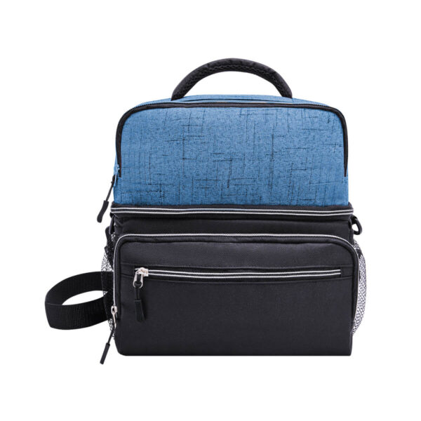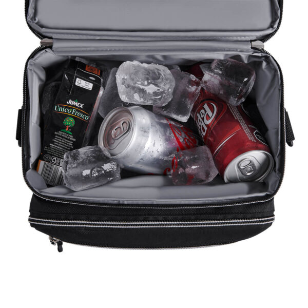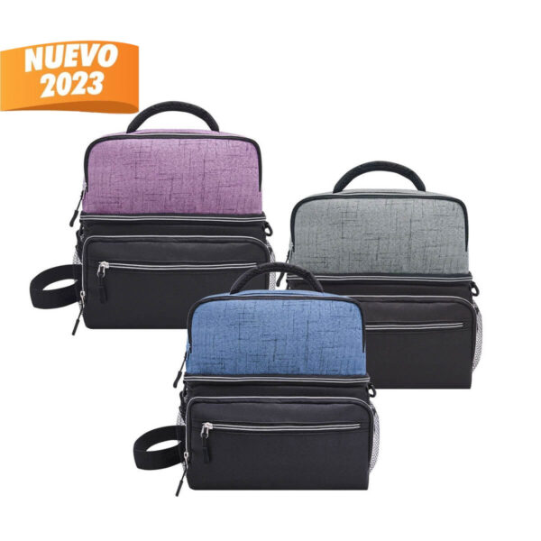 Interior plastificado impermeable. Bolsa frontal con cierre, bolsas laterales de red y correa ajustable acojinada.