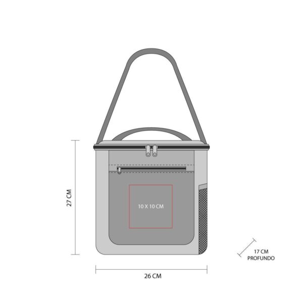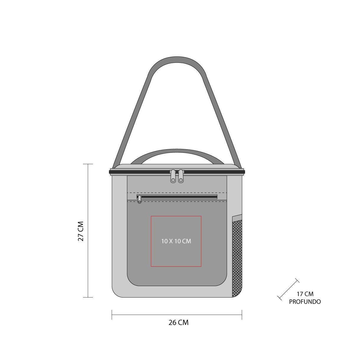 Hielera con interior plastificado impermeable. Bolsa principal y bolsa frontal con cierre. Bolsillo lateral de red. Incluye asa acolchada y correa larga ajustable. Capacidad para 24 latas.