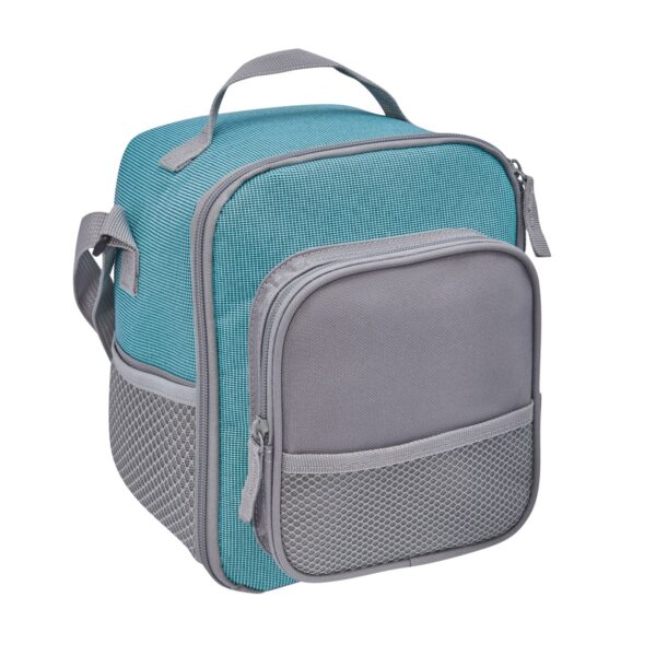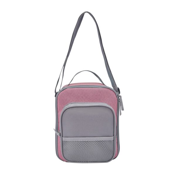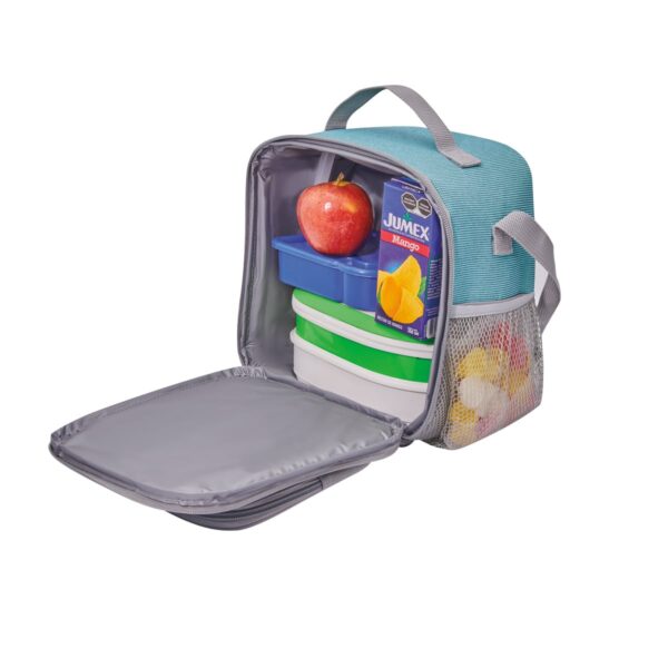 Interior plastificado impermeable. Bolsa principal con cierre, bolsa frontal con cierre y malla. Asa superior y asa para hombro ajustable.