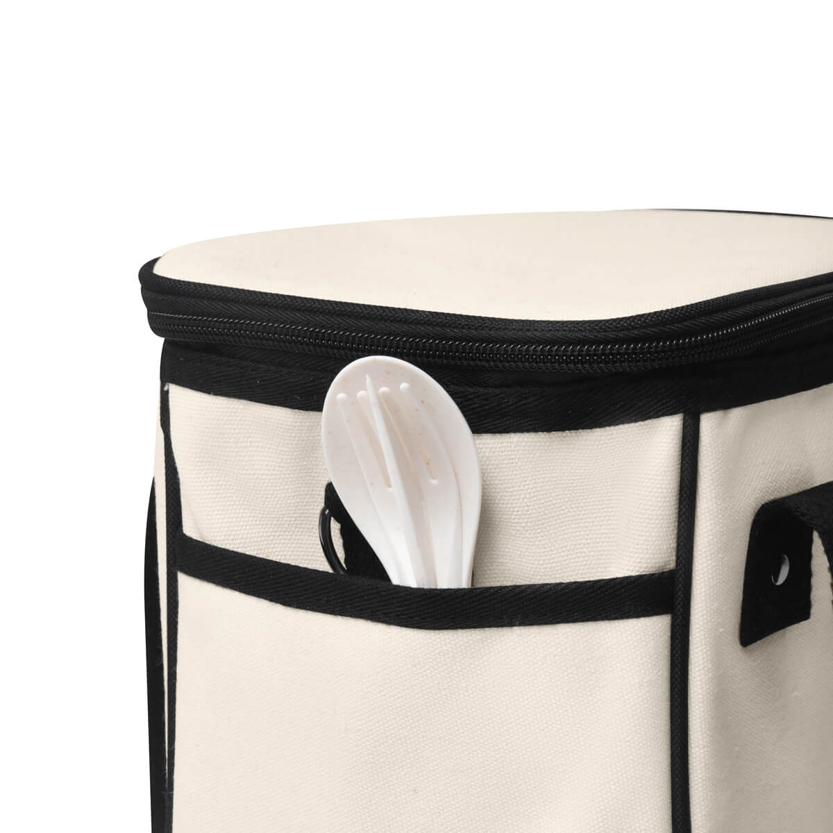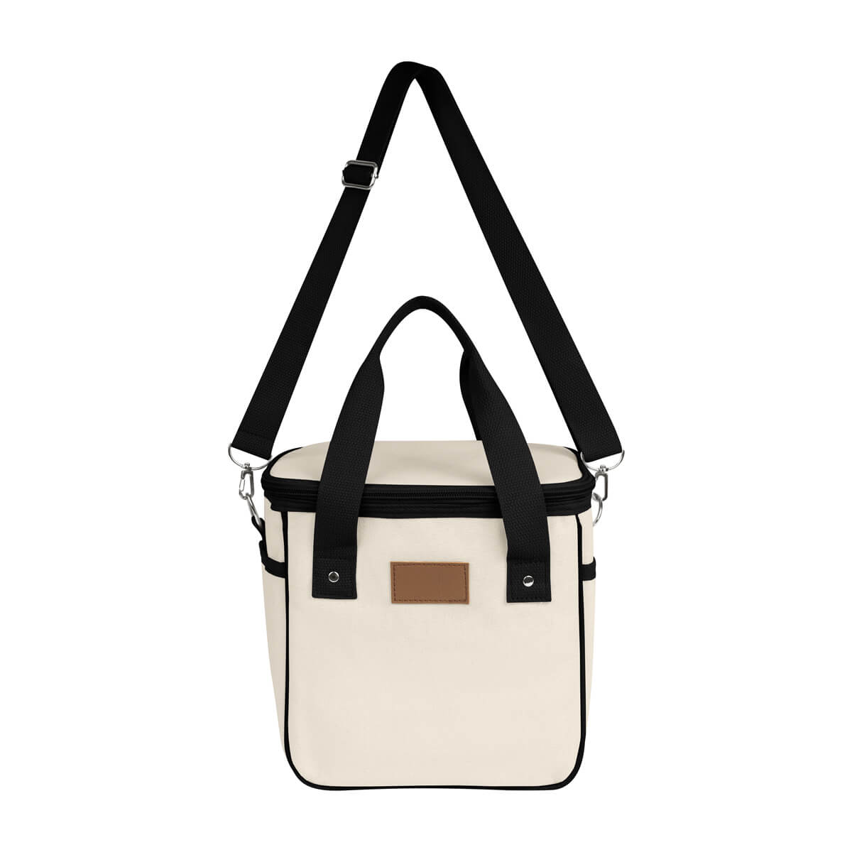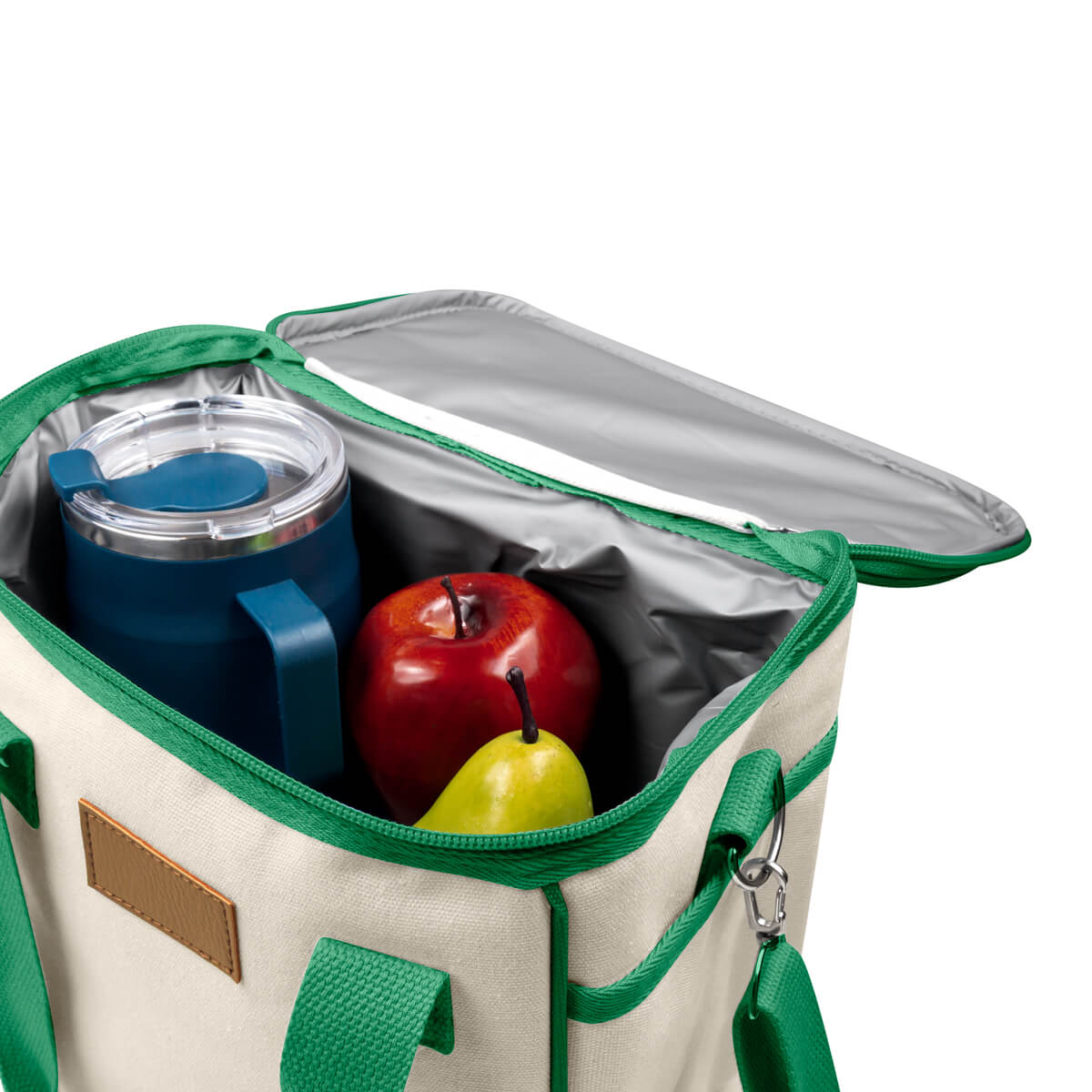 Hielera con interior sellado impermeable. Su exterior está fabricado en material algodón, un material amigable con el medio ambiente, que la hace una opción ecológica. Los detalles de color en asas y cierre le dan un toque moderno y vibrante, convirtiéndola en una opción única para llevar a picnics, la oficina o cualquier salida al aire libre. Capacidad para 9 latas.