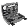 Contiene cables pasa corriente (100 amp), 9 dados, medidor de presión de aire, desarmador punta de cruz, desarmador punta plana, desarmador para dados. Incluye estuche de tela.