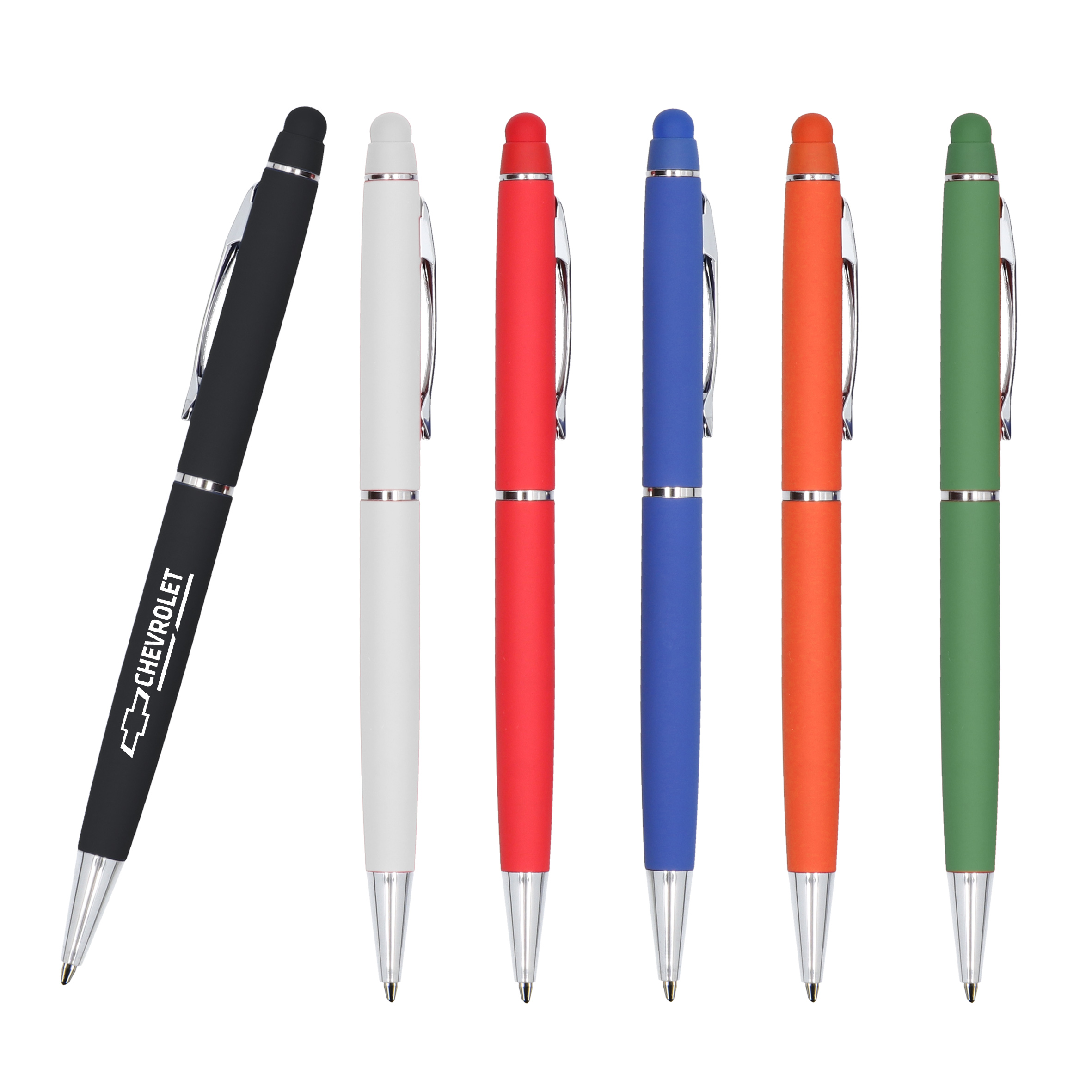 Bolígrafo metálico con acabado rubber y goma touch screen. Mecanismo retráctil.
