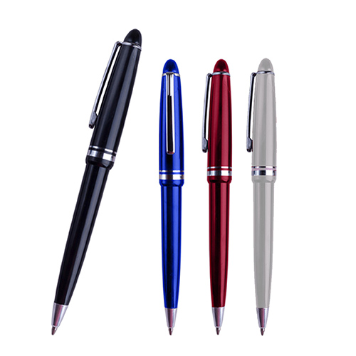 Bolígrafo de plástico con apariencia metálica y clip metálico.
