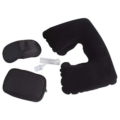 Contiene antifaz para dormir, almohada inflable de viaje, cepillo portátil, un par de tapones para oídos y estuche.