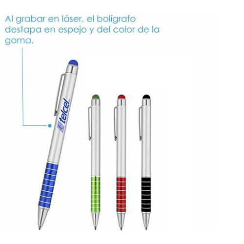 Bolígrafo metálico con mecanismo de click y goma touch screen. Al grabar en láser destapa en espejo del color de la goma.