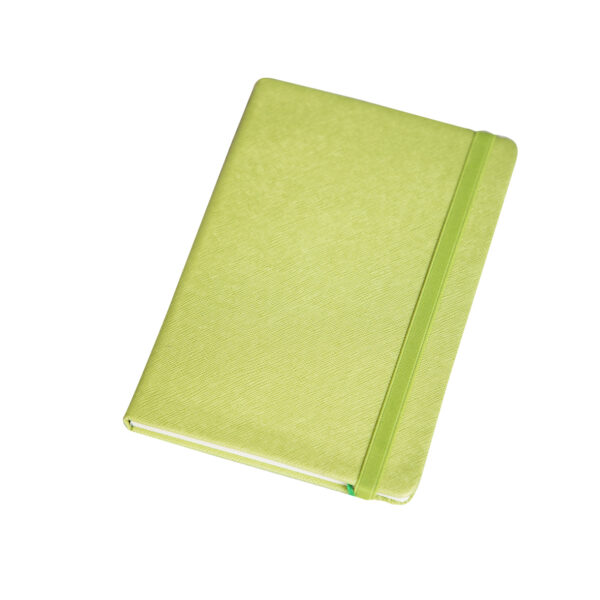 Libreta con pasta texturizada de apariencia metálica,separador y banda elástica para sujetar cubierta. Con 90 hojas rayadas.