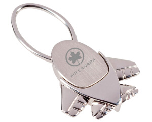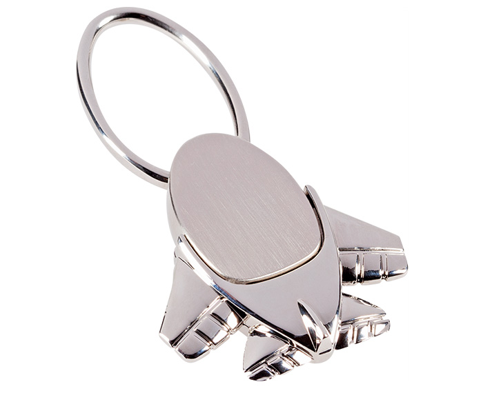 Llavero metálico en forma de avión, con argolla rígida giratoria, cierre a presión.