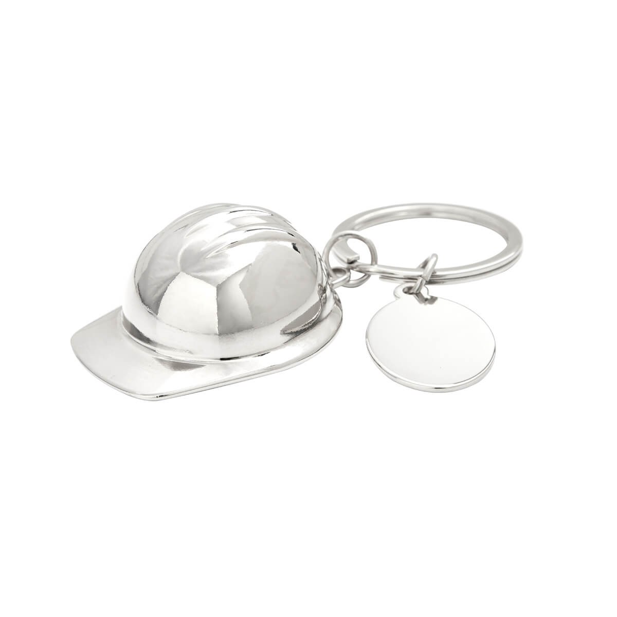 Llavero metálico con diseño en forma de casco. Accesorio perfecto para el sector industrial, construcción y seguridad. Incluye una placa ovalada para personalizar.