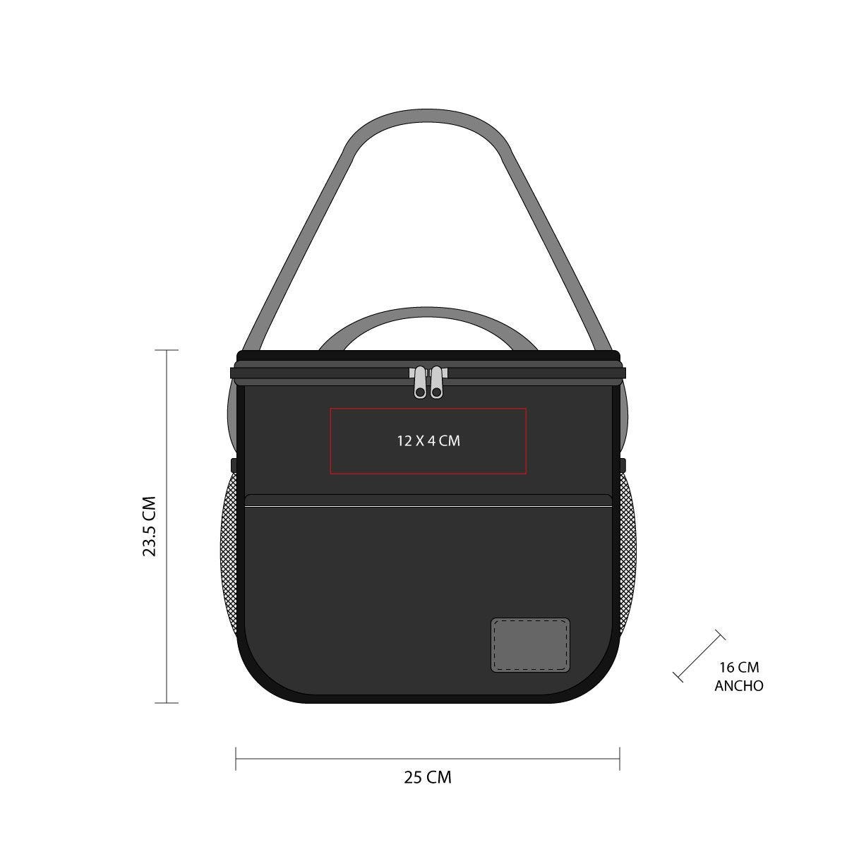 Lonchera con interior plastificado, bolsa principal con cierre, 2 bolsillos laterales de red y bolsa frontal con diseño capitonado y con parche de curpiel. Para mayor comodidad cuenta con asa de transporte superior y correa ajustable para hombro. Empaca tus alimentos y bebidas para el trabajo, escuela, viaje o picnic.