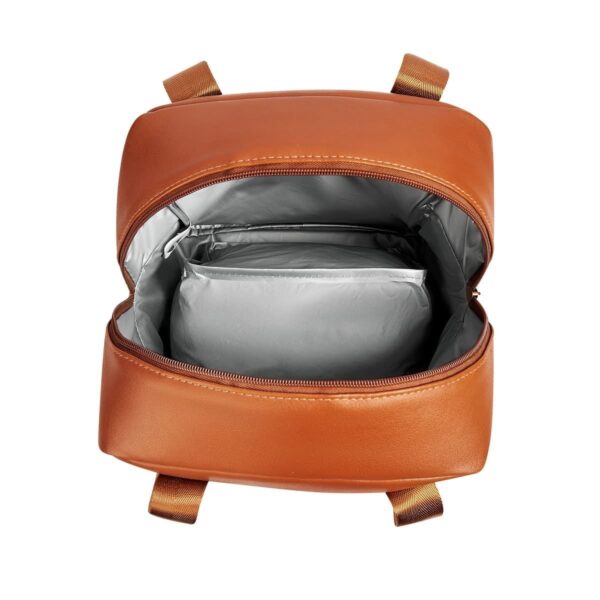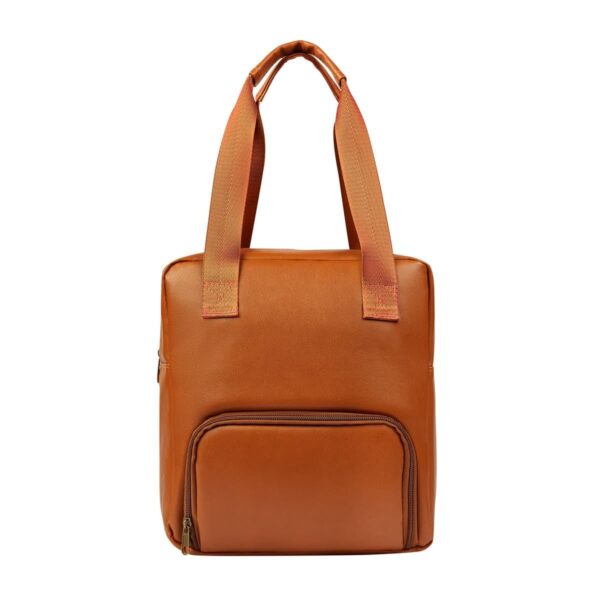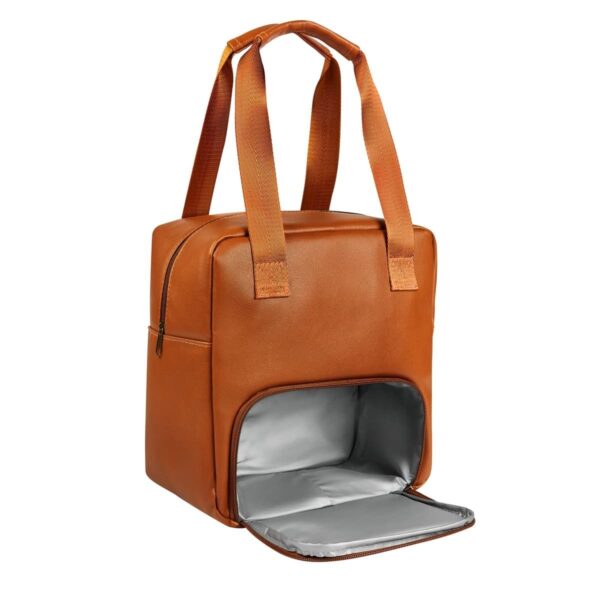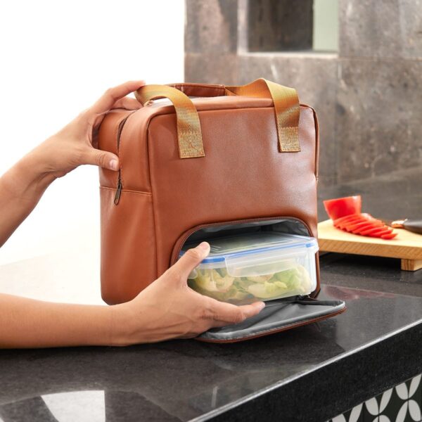 Lonchera de curpiel comoda y portátil. Ideal para llevar tus alimentos a la oficina o escuela. Compartimento principal y bolsa frontal con cierre. Asas de tela con agarre de curpiel.
