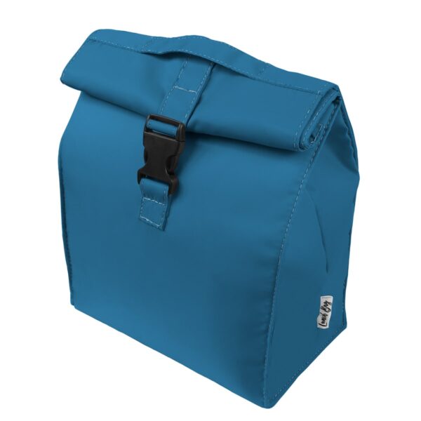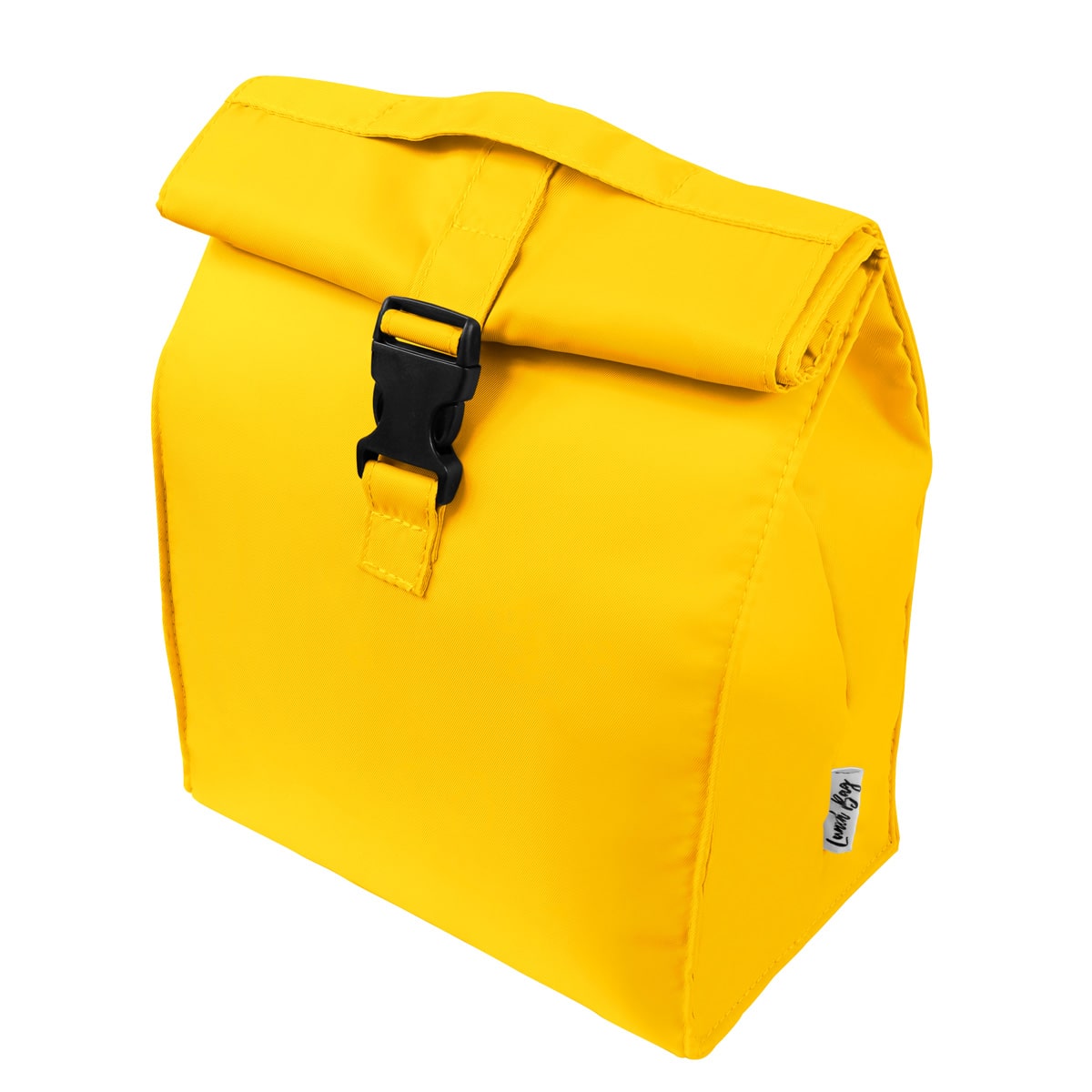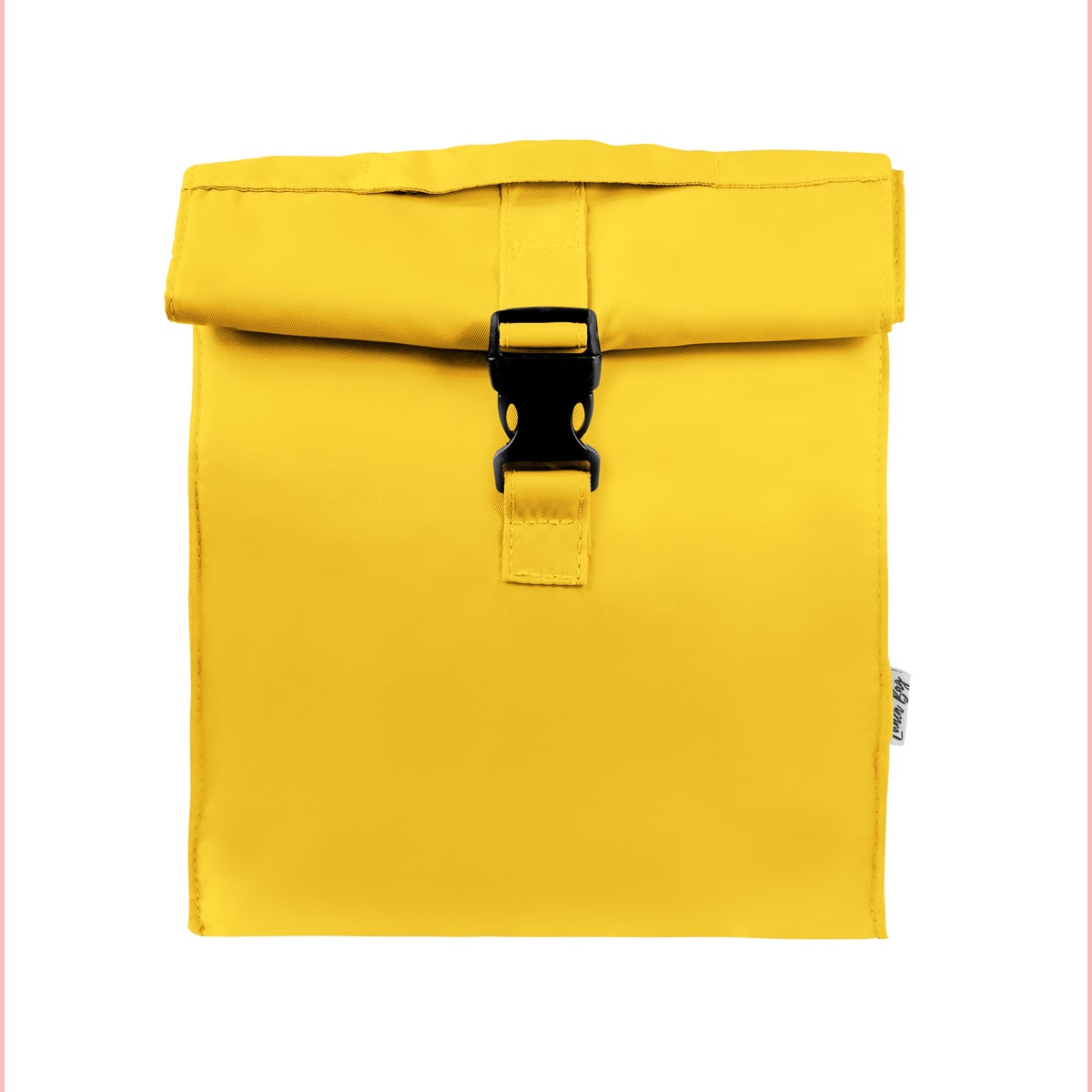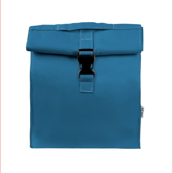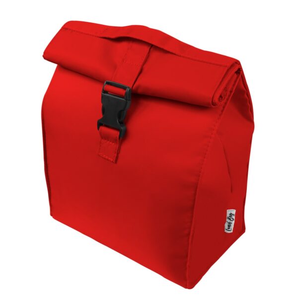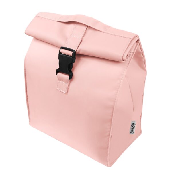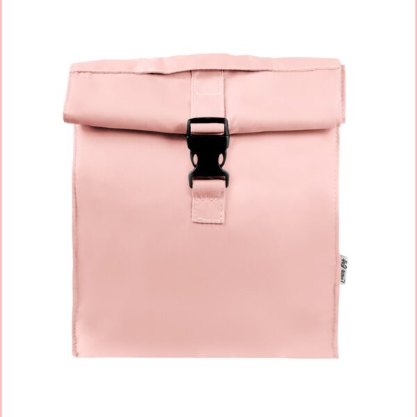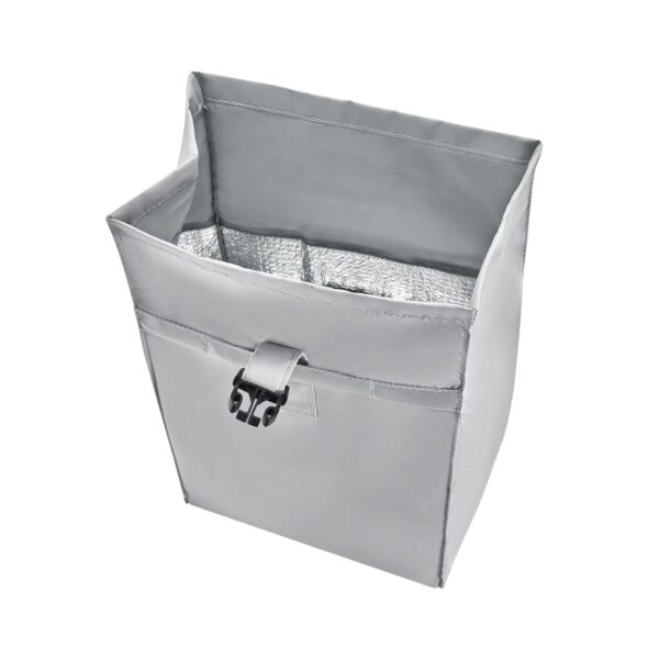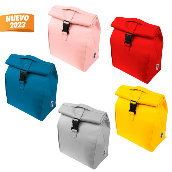 Interior metalizado. Bolsa principal con broche, solapa enrrollable, asa superior.