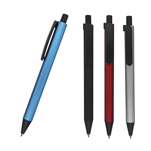 Bolígrafo de plástico de apariencia metálica con mecanismo de click.