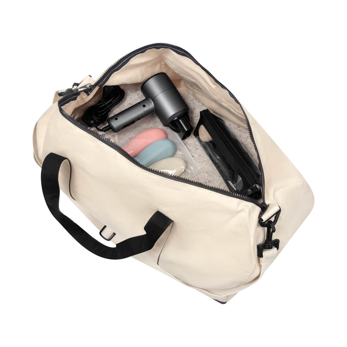 Su compartimento principal con cierre destaca por su tamaño súper amplio, perfecto para llevar todo lo necesario con comodidad. Incluye asas de mano para un fácil agarre y una práctica asa para hombro removible, sujeta con un broche de plástico para mayor seguridad. Además, cuenta con un bolsillo frontal con cierre que brinda acceso rápido a objetos pequeños o esenciales. Esta maleta ecológica está fabricada con material algodón, es la compañera ideal para viajes o escapadas de fin de semana.