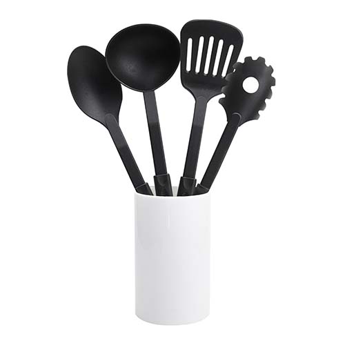 Incluye base y 4 utensilios de cocina: cuchara, cucharón, pala y cuchara de pasta.