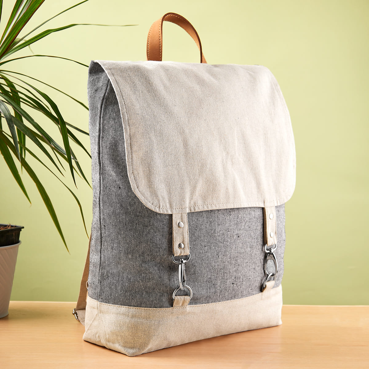 Mochila ecológica de algodón reciclado. Compartimento principal con cerrado de solapa y 2 broches metálicos. Asa superior y asas para hombro ajustables.