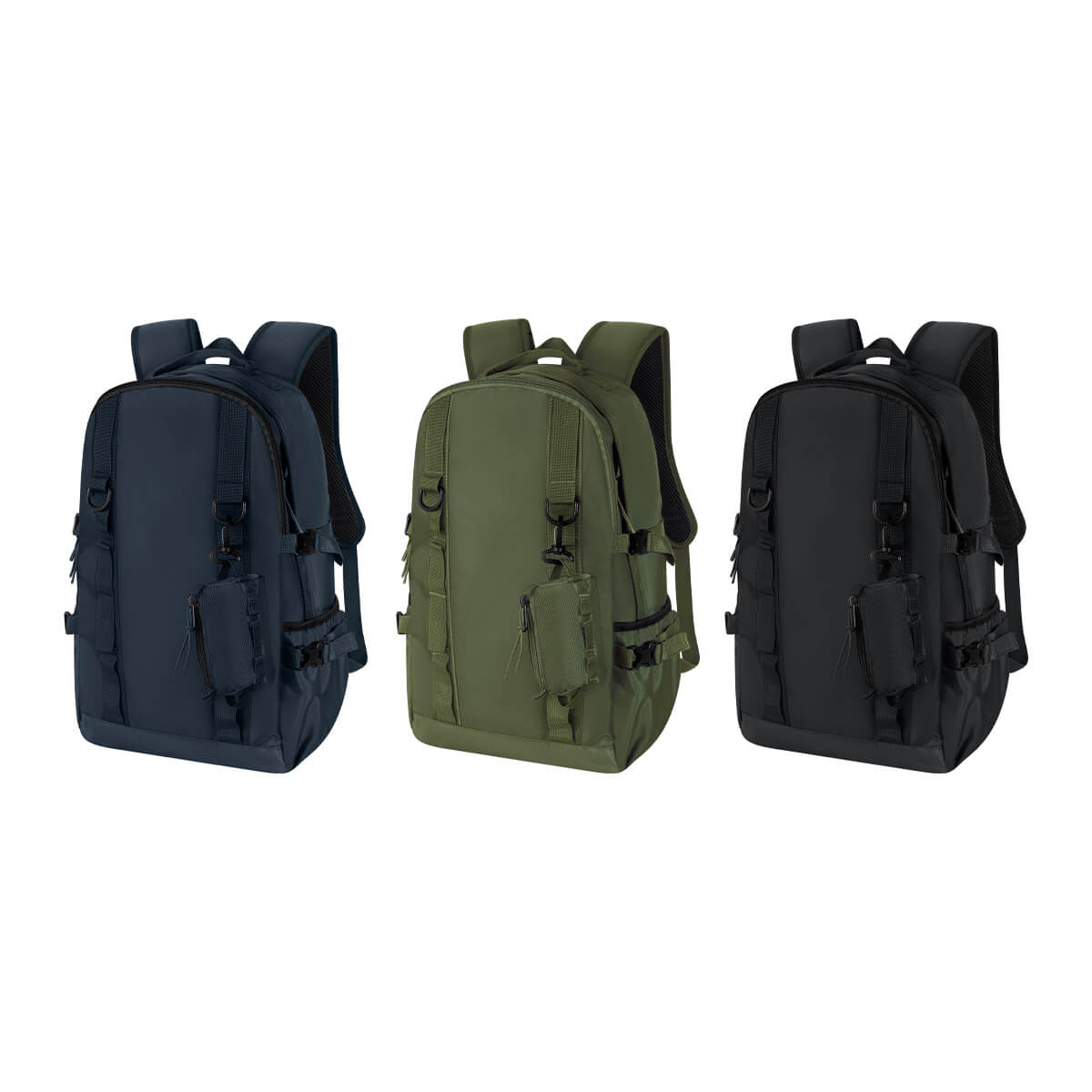 Mochila de viaje con diseño deportivo. Su bolsillo principal con cierre incluye un compartimento para laptop de hasta 15’’ y un bolsillo de malla para organizar tus accesorios. En su exterior, agrega un amplio bolsillo frontal y dos bolsillos laterales. Su práctico diseño permite colgar diferentes accesorios, gracias a sus correas frontales, además incluye un mini estuche removible. En la parte posterior, su respaldo acoginado ayuda a tener mayor comodidad y poder llevarla contigo en largas jornadas.