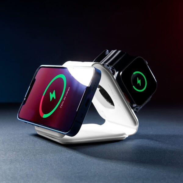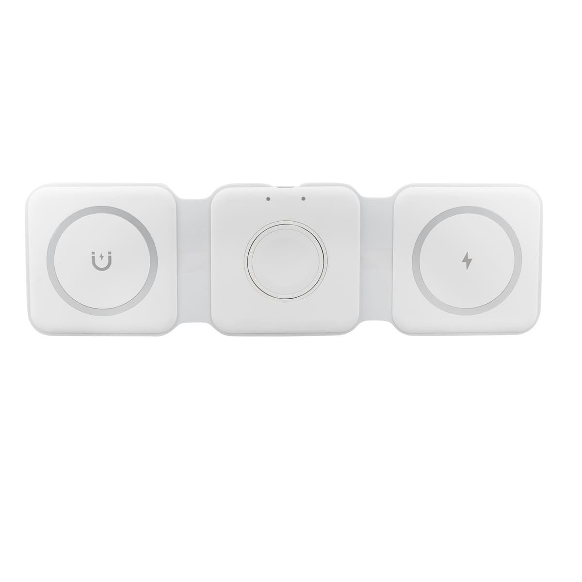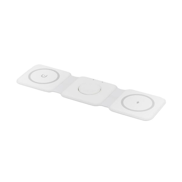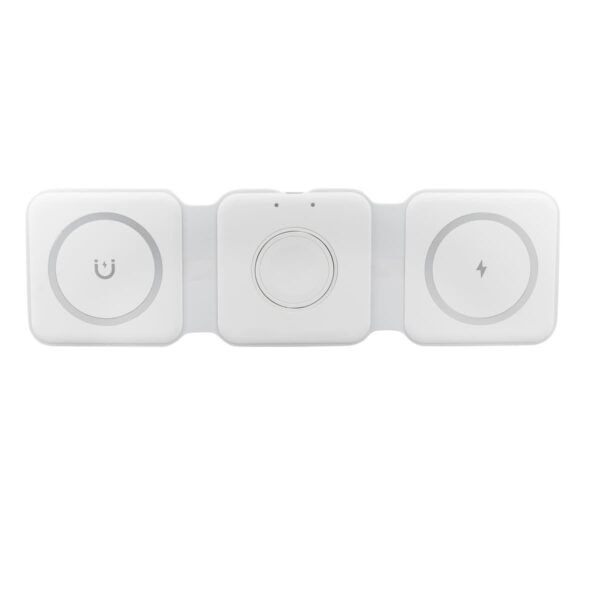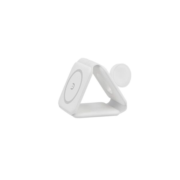 Cargador inalámbrico con diseño plegable. Terminado tipo rubber. Triple función. Incluye estación de carga para smartphone, reloj inteligente y audífonos. Velocidad de carga para smartphone de 15W (Compatible con 5W / 7.5W / 10W), velocidad de carga de 3W y 2.5 W para audífonos y reloj inteligente respectivamente. Incluye cable auxiliar de 1m con conector tipo C en entrada y salida. LED indicador de carga. Compatible con dispositivos que cuenten con tecnología de carga inalámbrica.