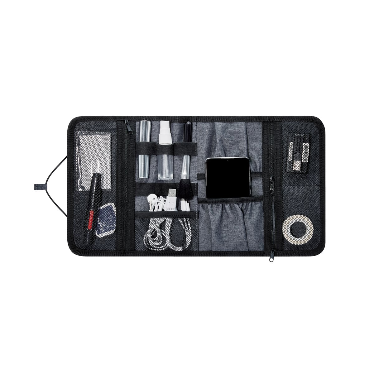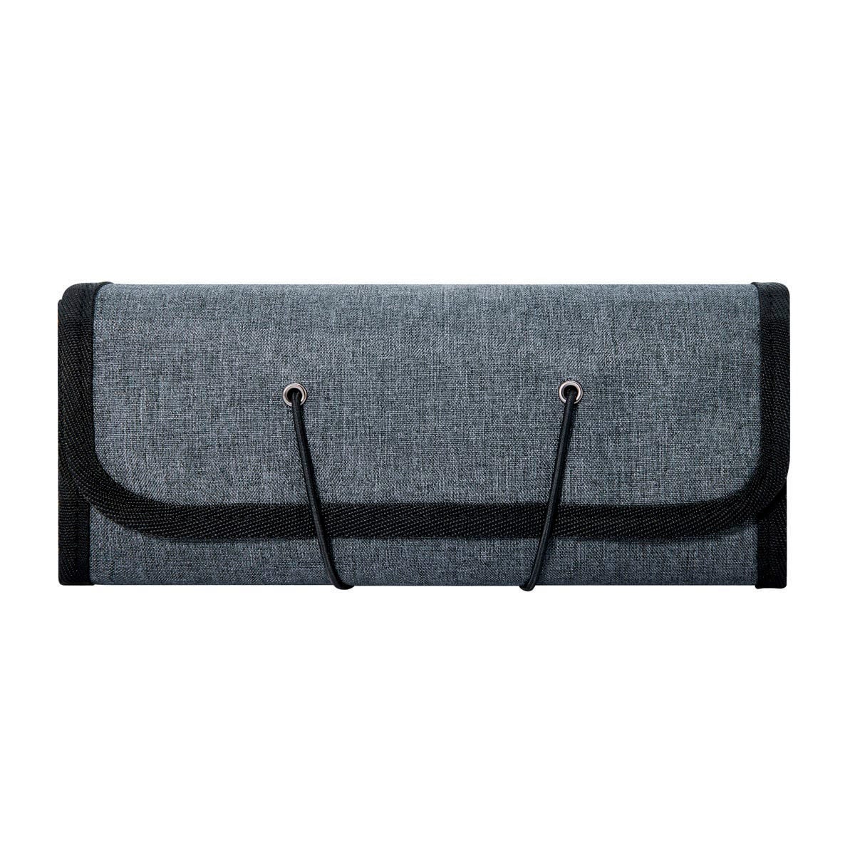 Organizador enrollable para accesorios. Contiene dos compartimentos con cierre y malla, un compartimento intermedio con bandas elásticas y un compartimento con dos bolsillos. Cierre con elástico.