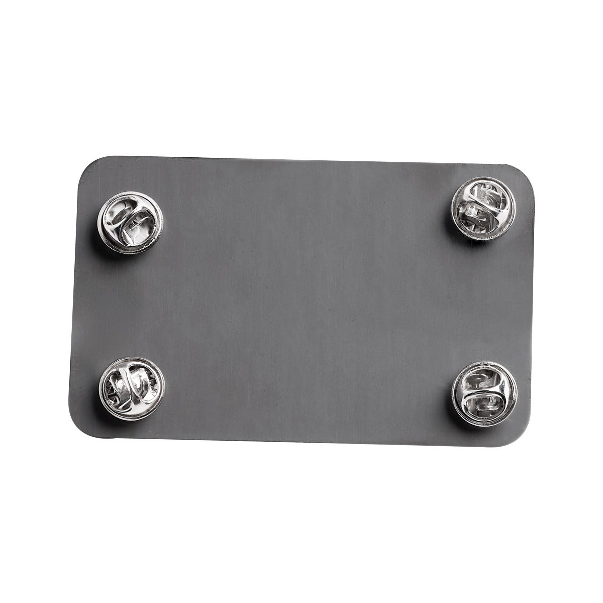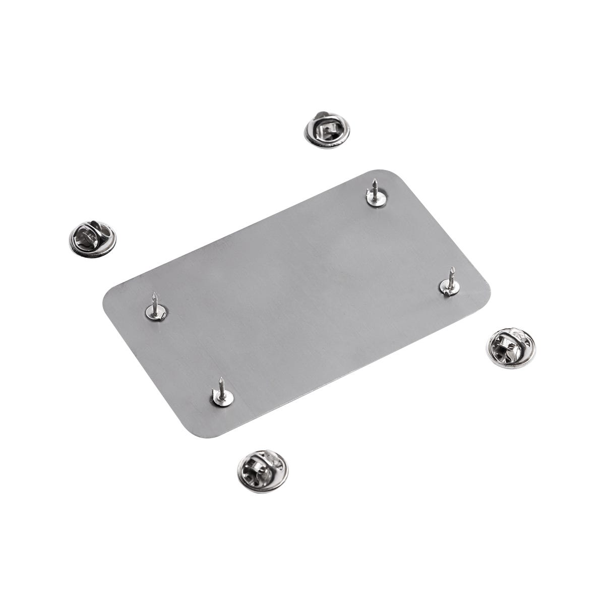 Placa metálica para grabado grande. Incluye 4 pines de presión, mica adherente protectora y bolsa individual. Grosor máximo de encaje 5 mm. Disponible a la venta únicamente en la compra de algún producto textil de catálogo. El precio incluye el grabado de un logo y una posición. Mínimo para grabado de 50 piezas. No aplica grabado personalizado.