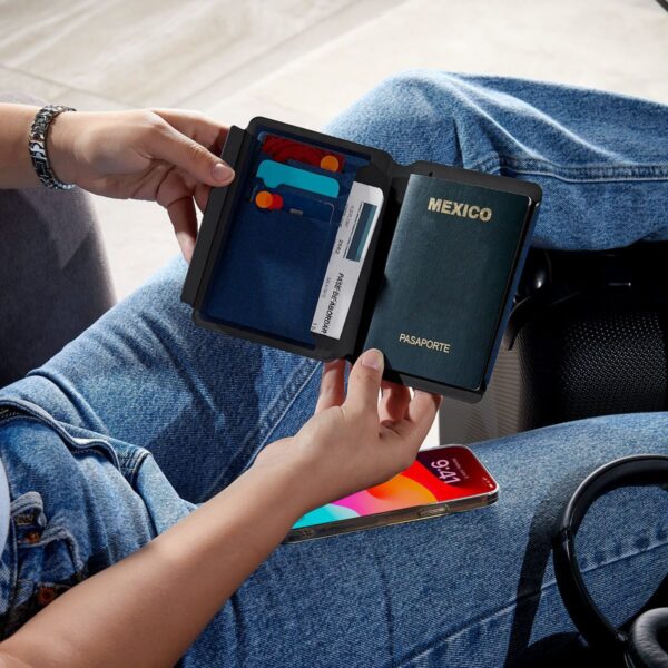 Funda para pasaporte con cierre magnético. Ideal para mantener los documentos seguros, libres de polvo y evita que se maltraten. Incluye 3 ranuras para tarjetas y 1 bolsillo adicional. Llévalo facilmente para cualquier viaje.