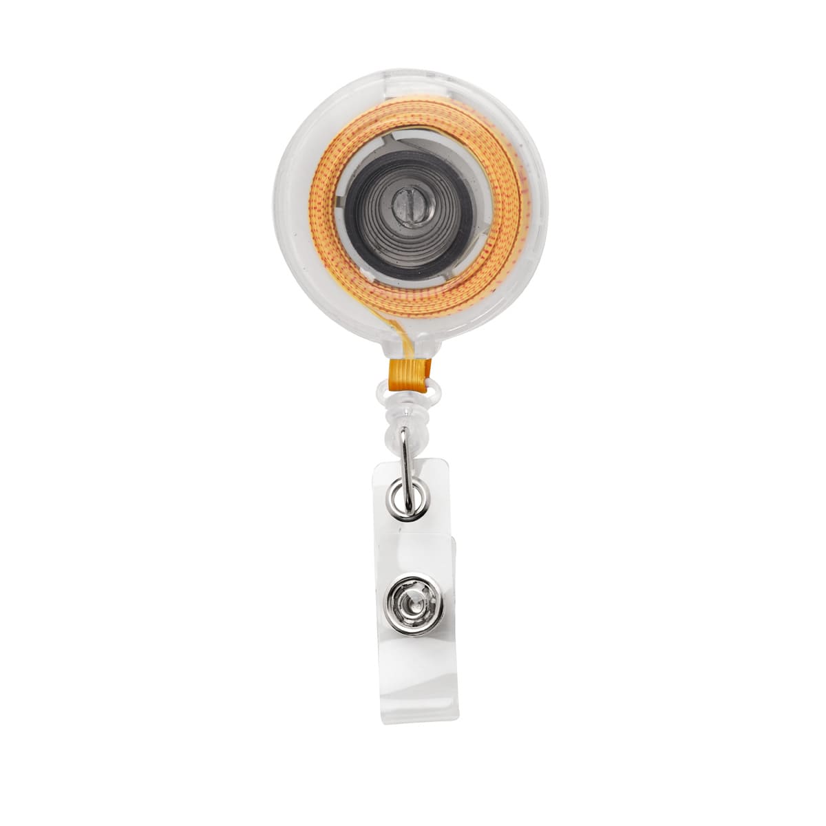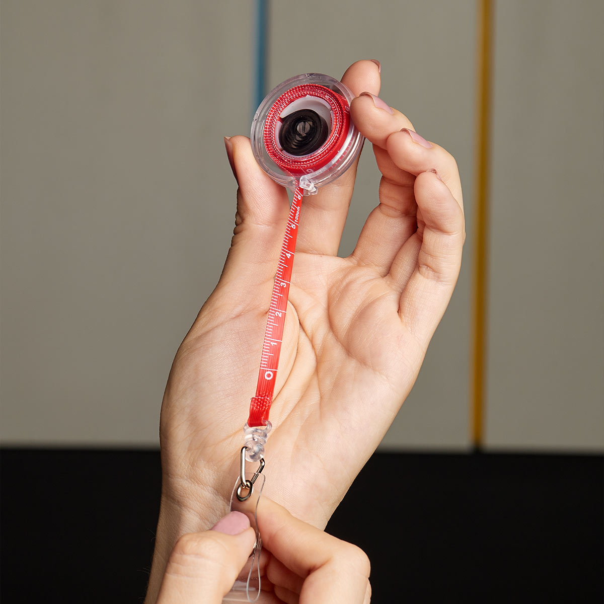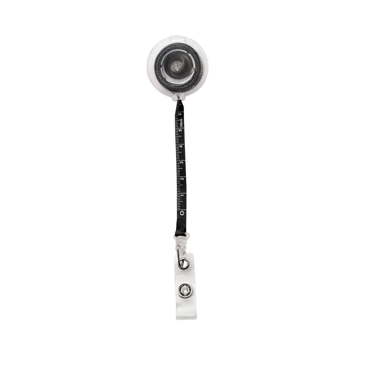 Porta gafete retráctil con clip sujetador. Incluye flexómetro de 100 cm.