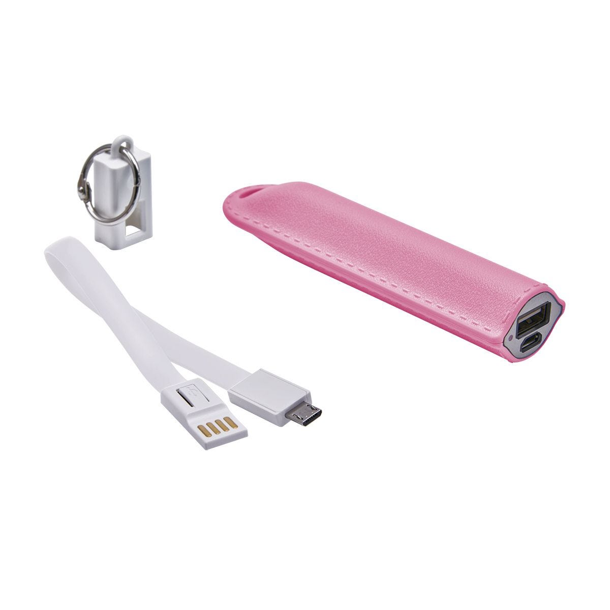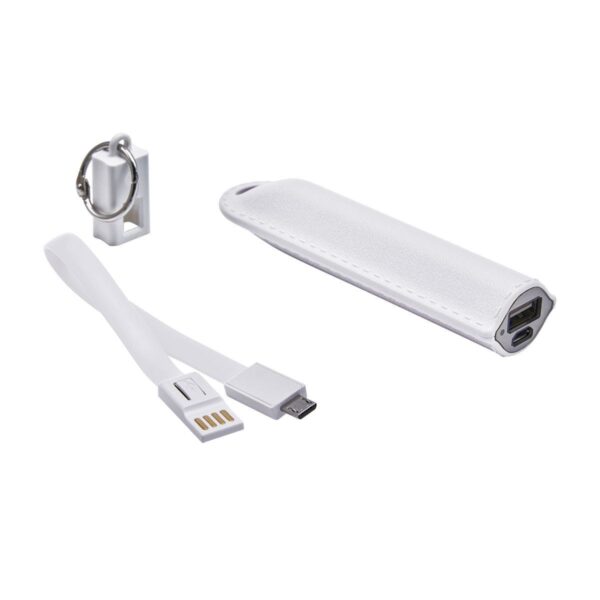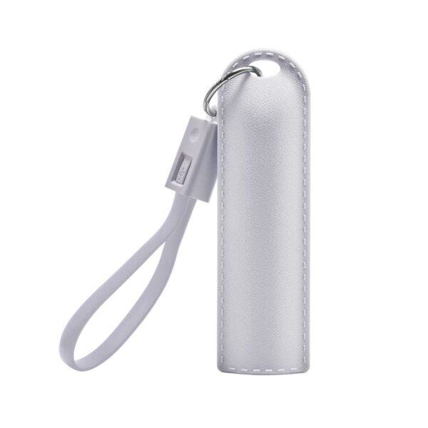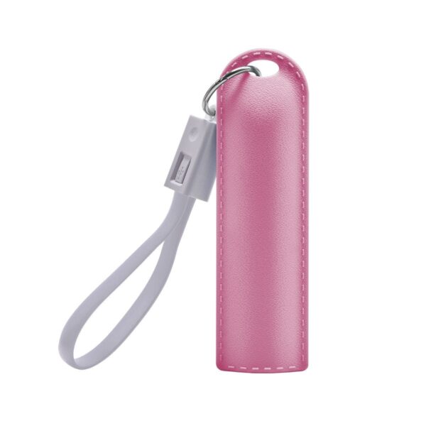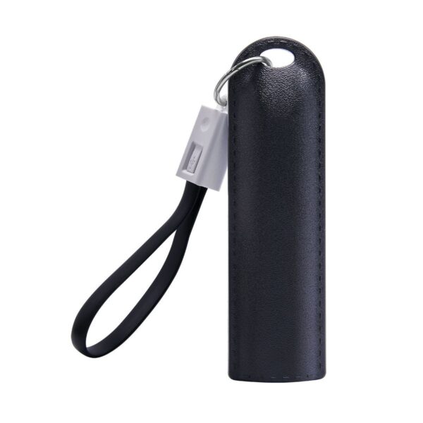 Batería auxiliar para smartphone, capacidad 2,600 mAh. Textura tipo piel. Puerto USB y micro USB. Contiene indicador de carga de 1 LED y cable micro USB de silicón con argolla.